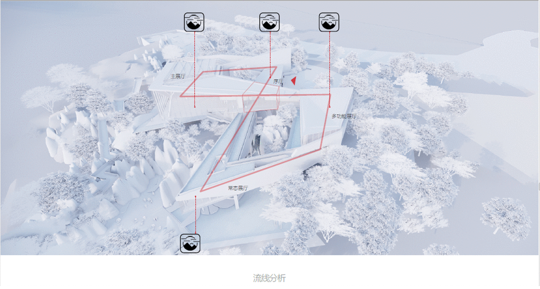 02. 借景 半山高处,壮美的风景沿远、中、近的层次一一铺展,为建筑布局朝向带来线索。在连续的标高变化中,被拆解的美术馆空间嵌套在“∞”字形游走路径之上,或并置,或串接。通过塑造不同点位的框景,使展陈与环境叠加相融,衬托“舀一瓢滇池,置于半山”的建筑氛围。