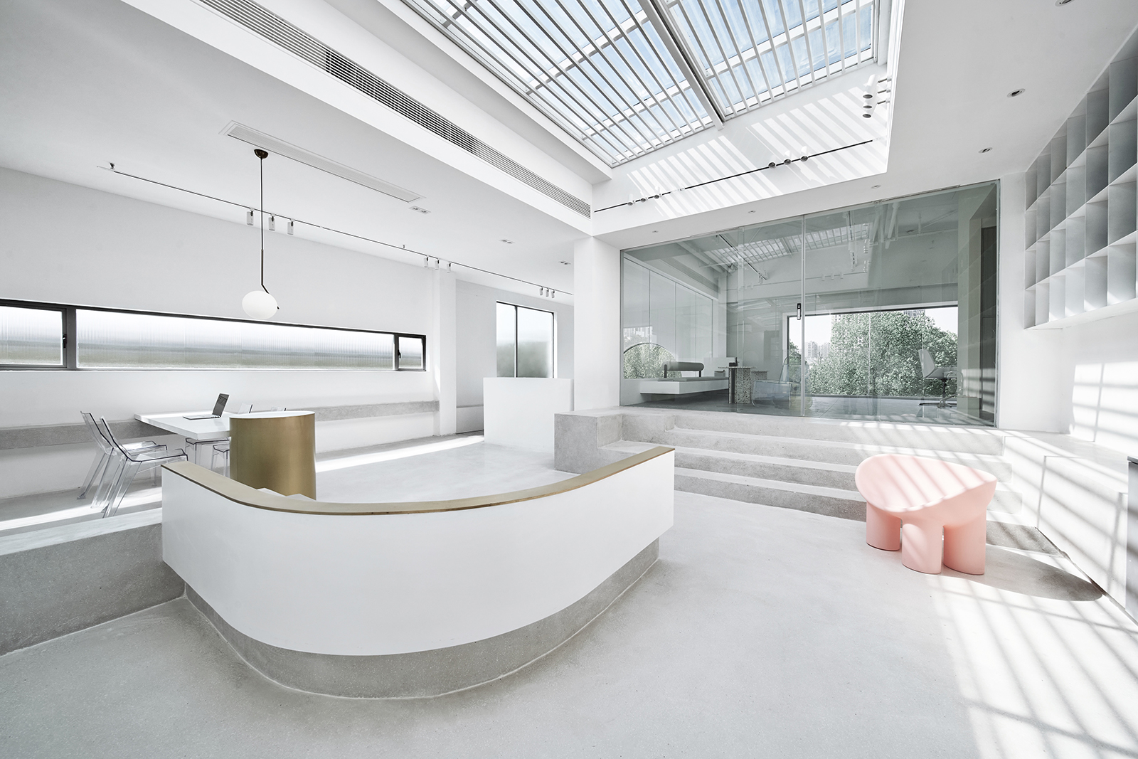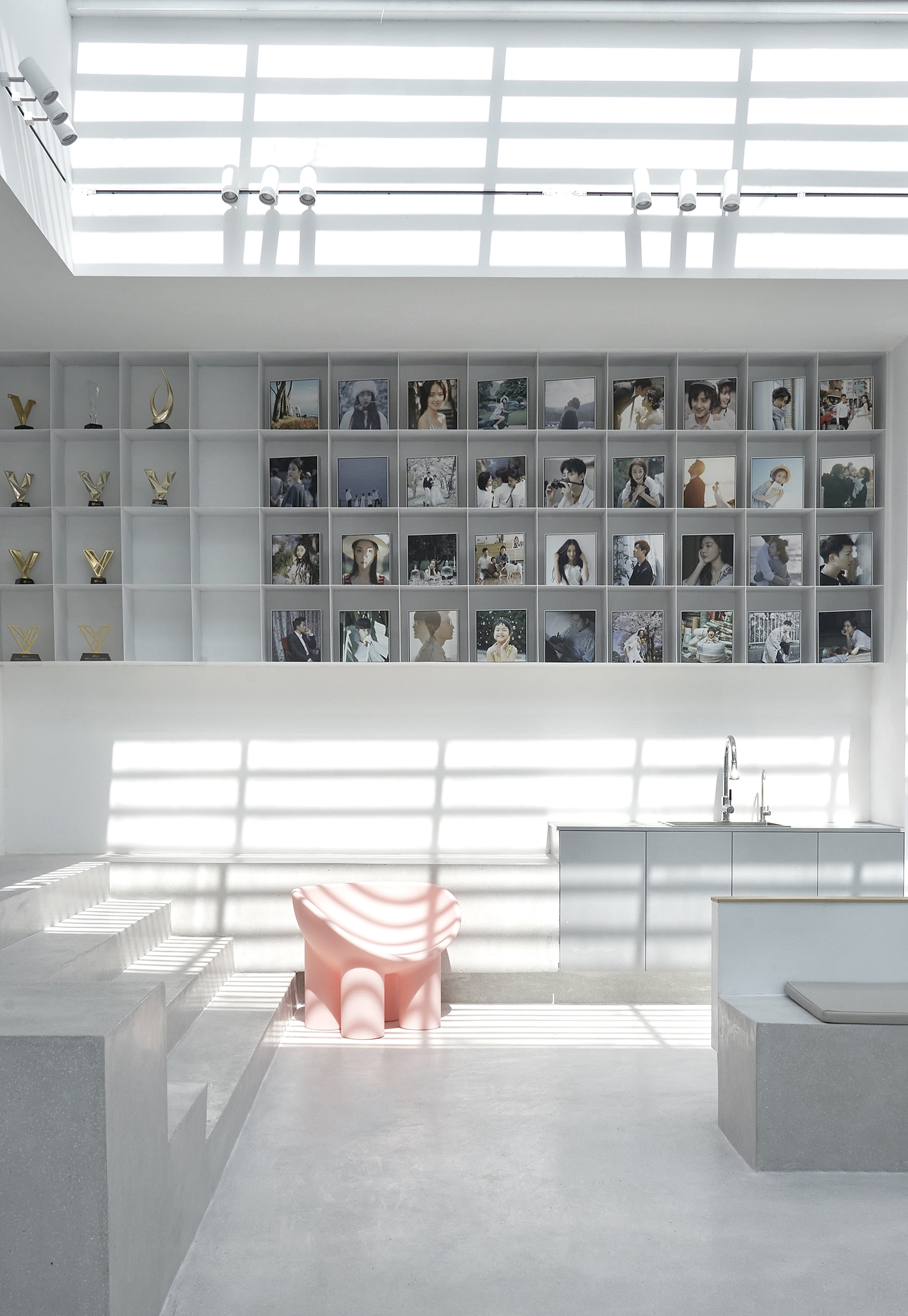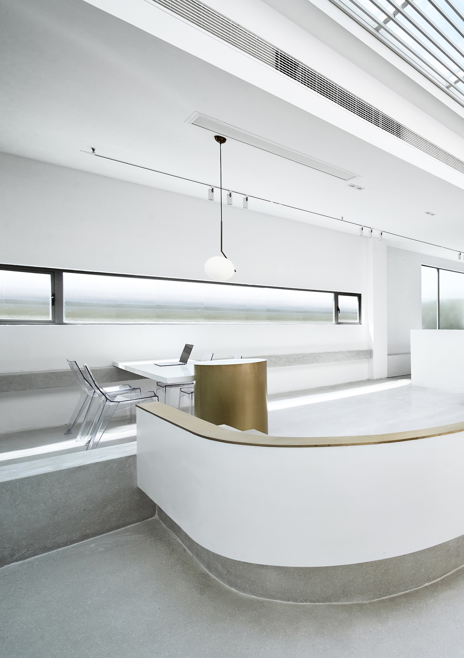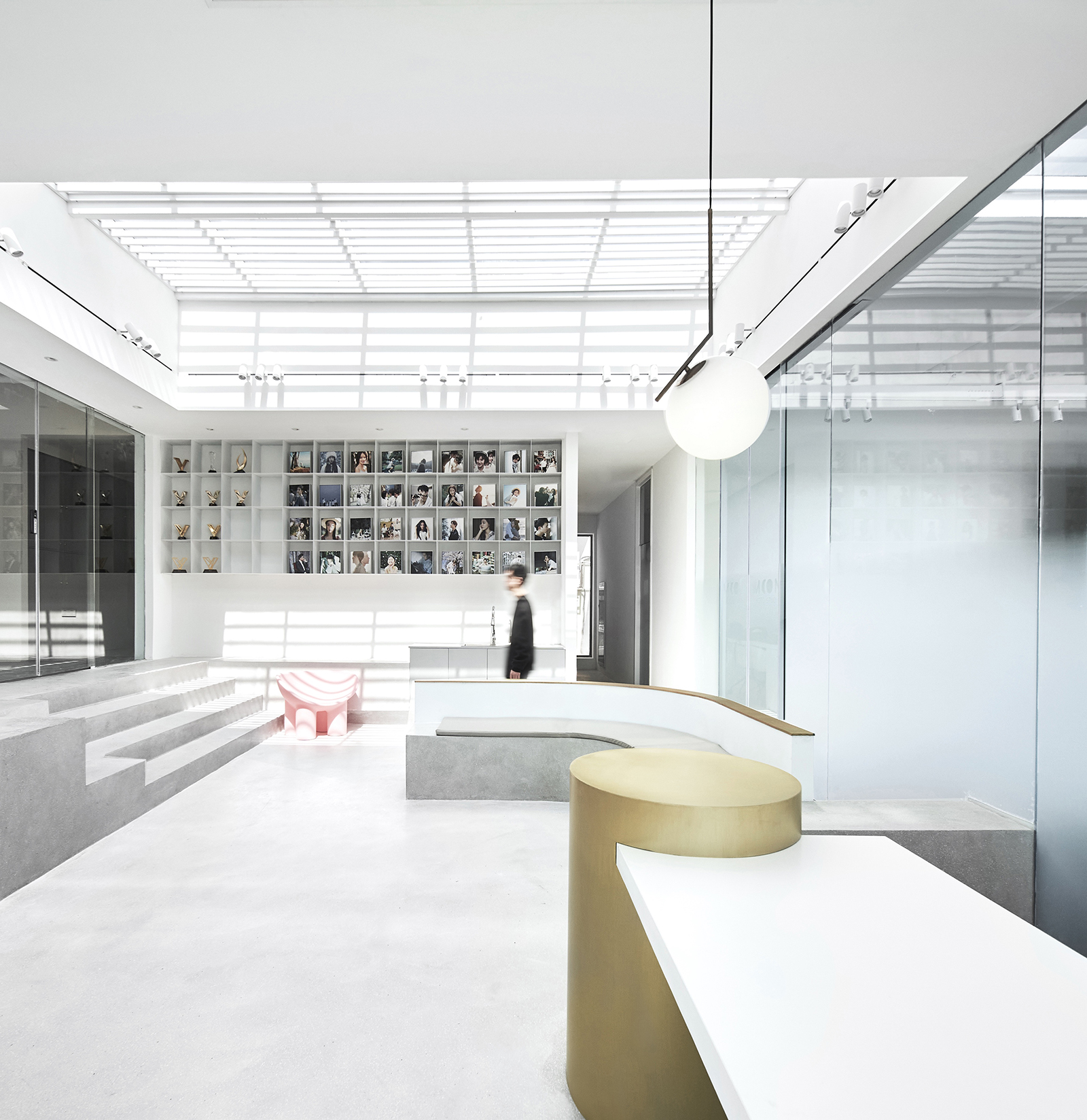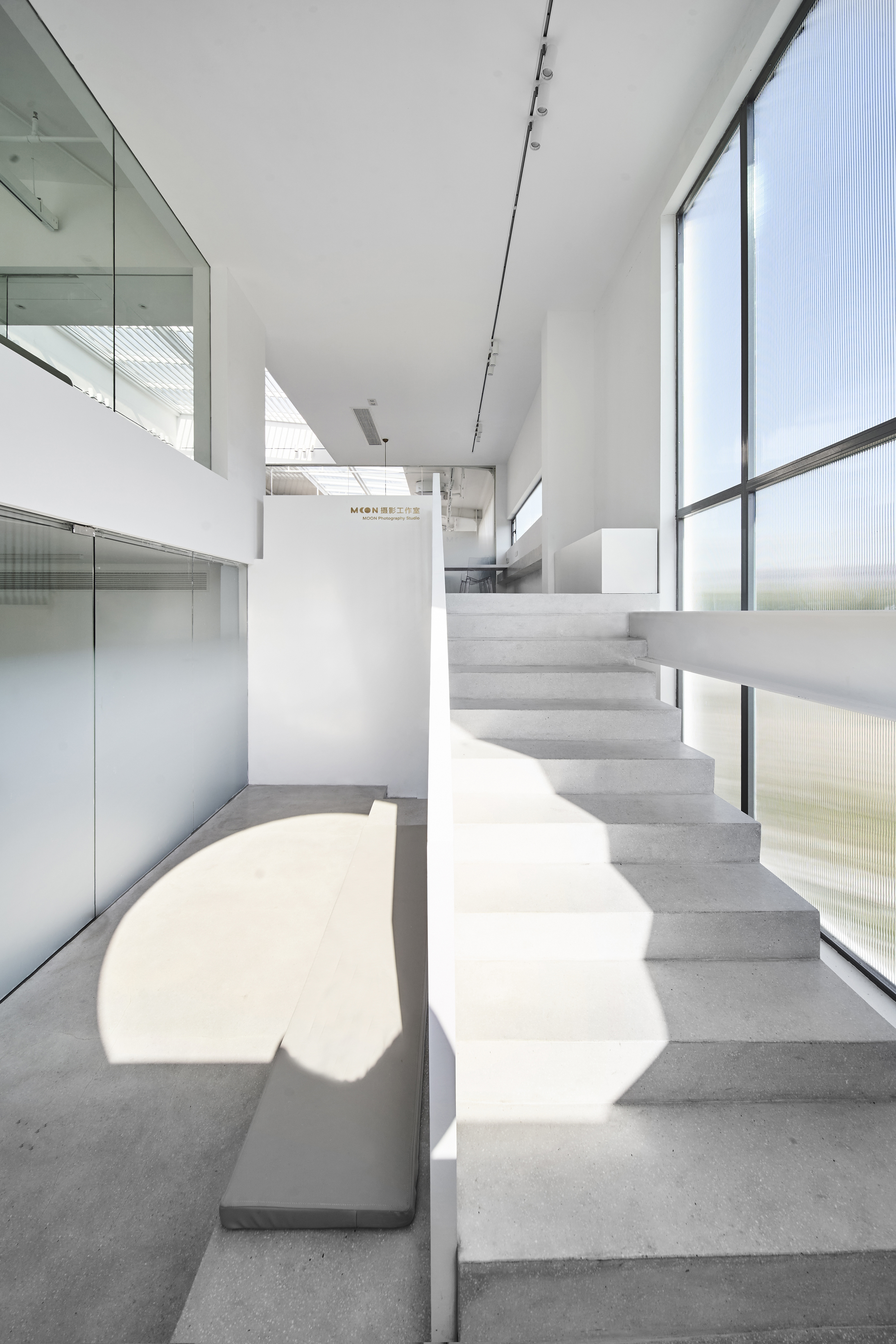 摄影工作室 Photo Studio MOON摄影工作室部分,去除了多余的造型,留下一个纯白的干净空间,给人以放松感,在满足功能需求下,屋顶面切割出长条形的天窗,计算完比例后,在接待区部分增加白色格栅以过滤光线,阳光透过格栅游走于纯白的墙面,使三维的空间有了一份时间的感知,给原本的物质空间增加了一份诗意。