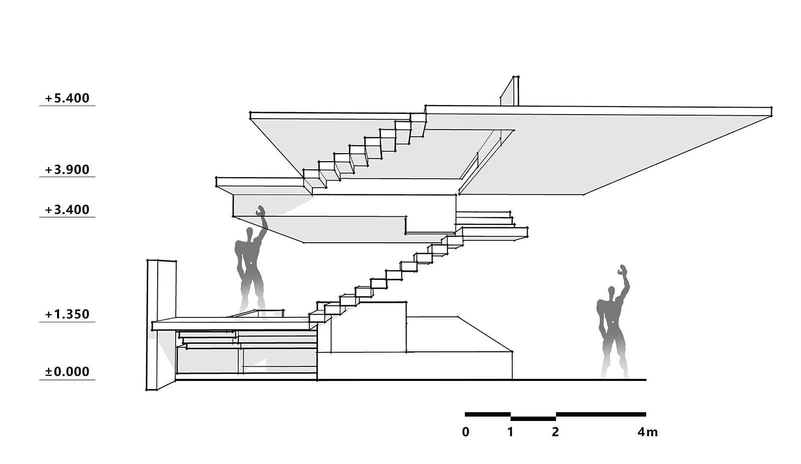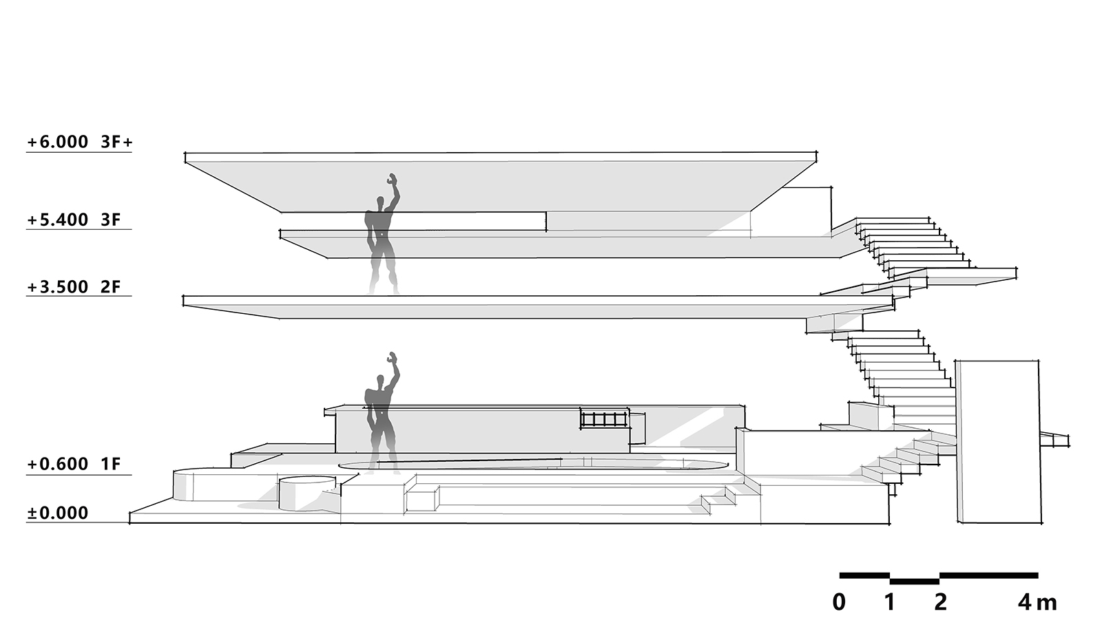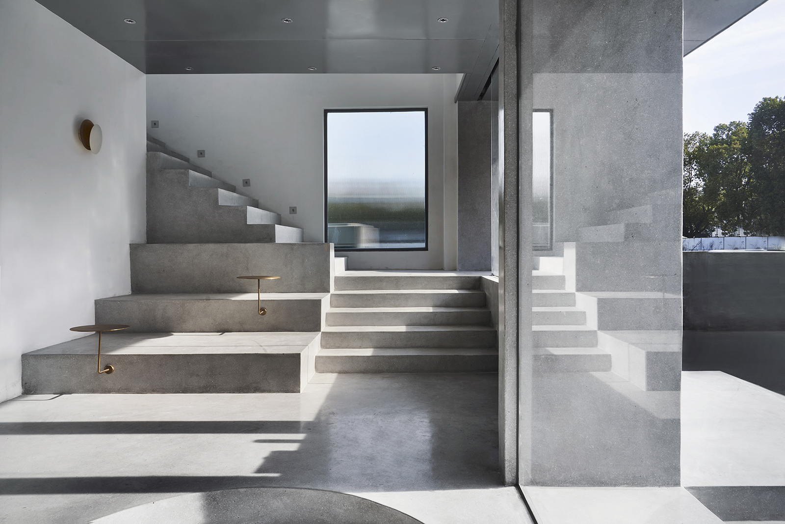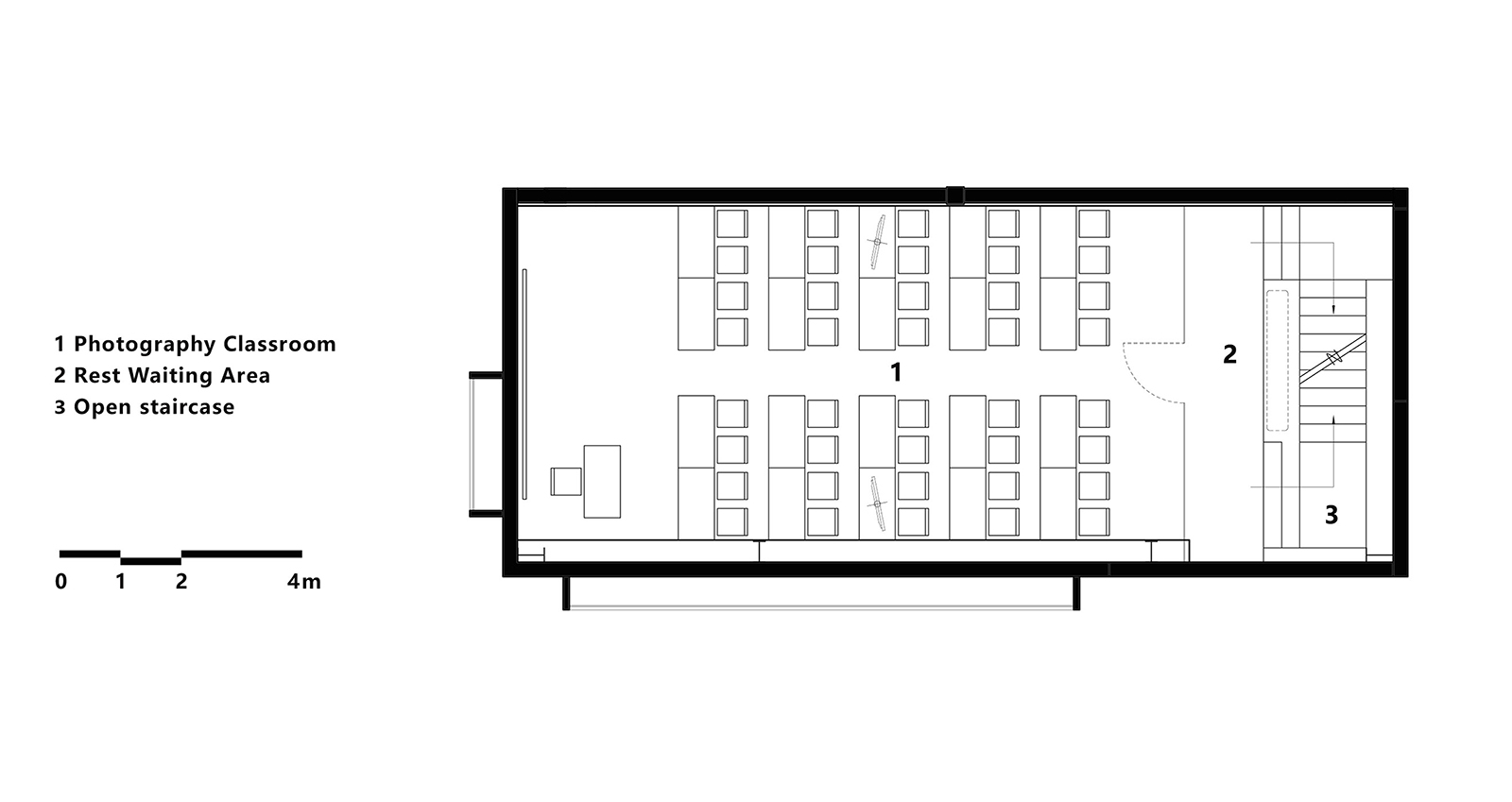 空间划分 Space division 将前端的两层建筑体作为三层划分,重新确立空间尺度。阶梯作为连接三层空间的主要路径,承担着三维坐标轴的角色。长方体块的直向运动呈现阶梯的连续状态,在这个纵向的空间里,我们设计了一个镜头状的圆形窗,使这个纵向路径有了横向的视线,同时镜头的形式给窗户的功能带来窥视感,形成趣味性的第二空间体验。