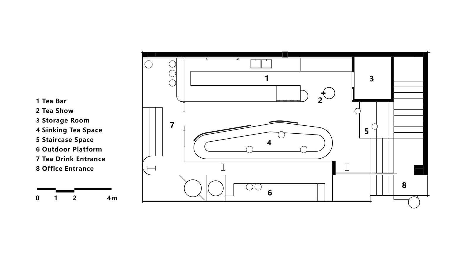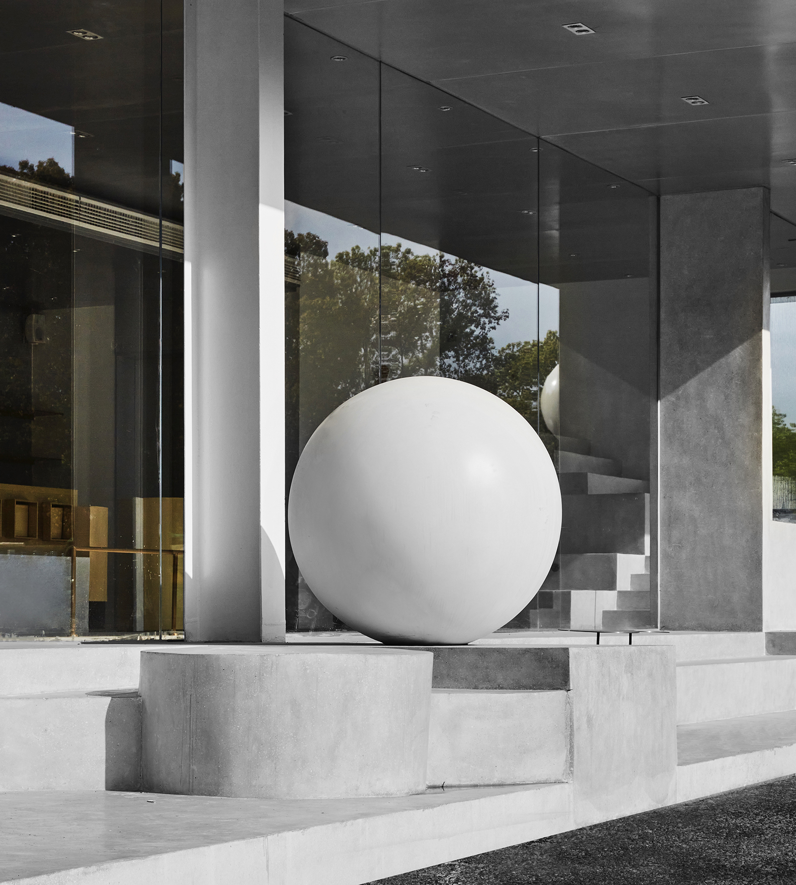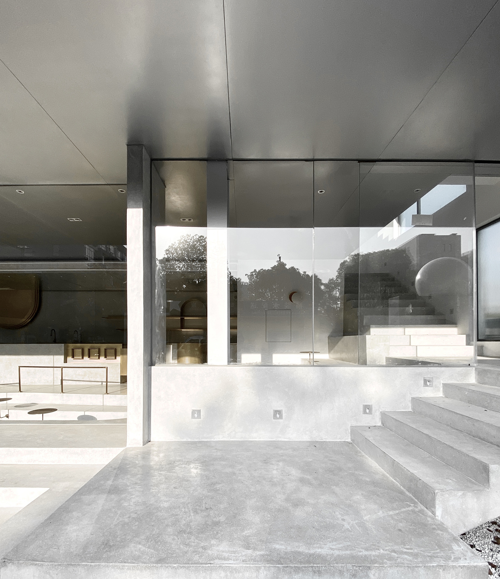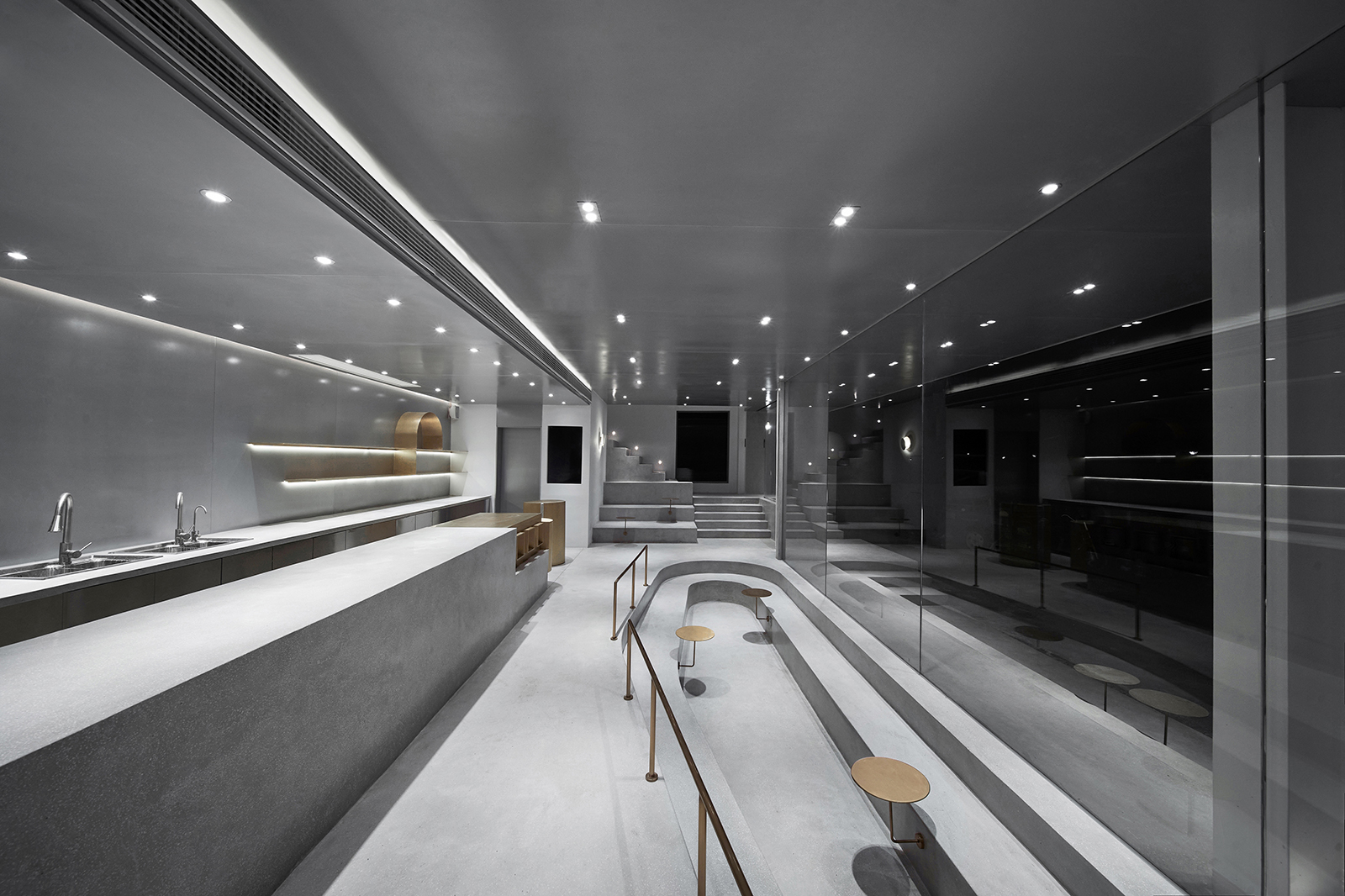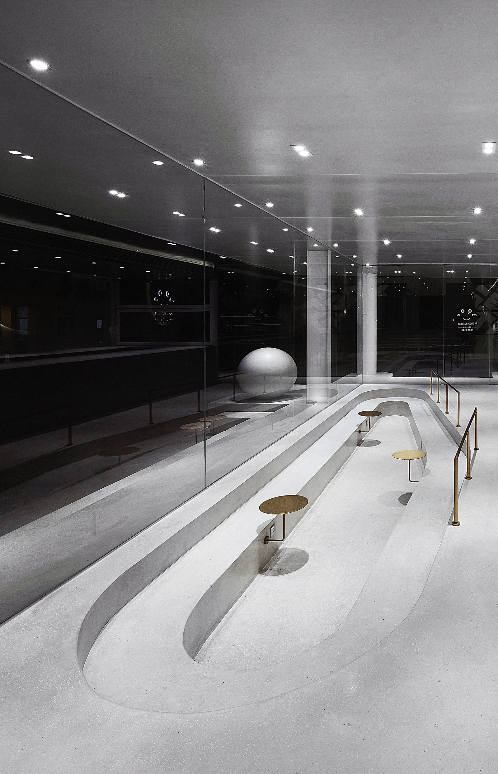 夜晚从外部观察,整个一层成为一个透明的发光体,使建筑呈现悬浮的状态,营造出具有强烈记忆点的视觉效果。