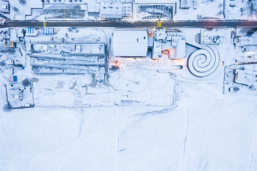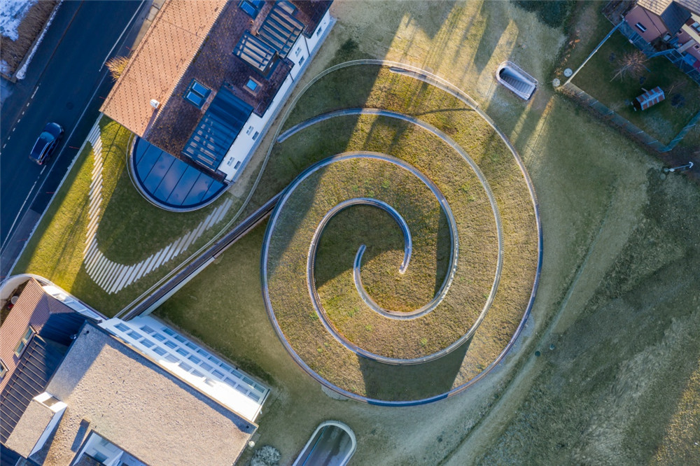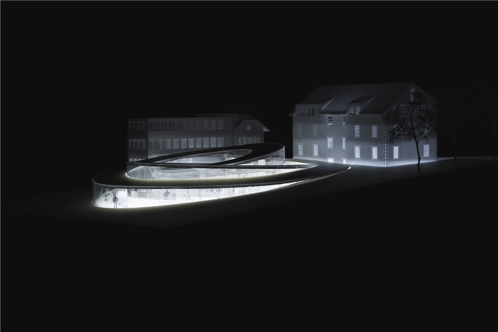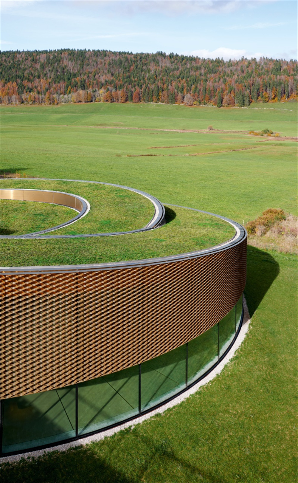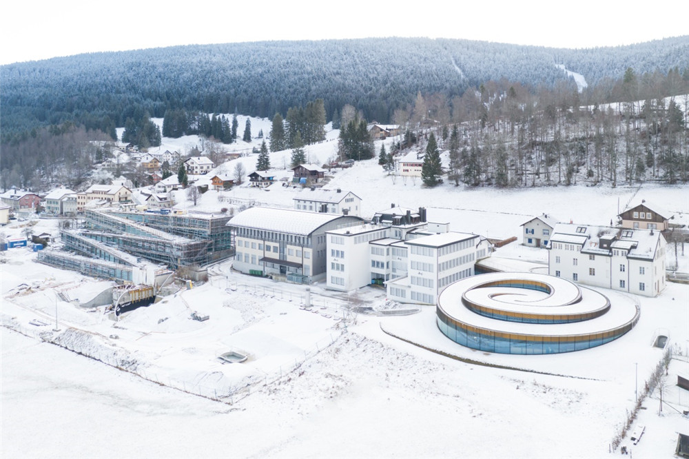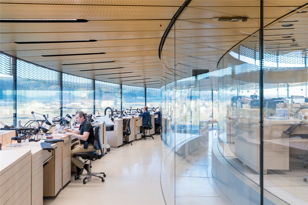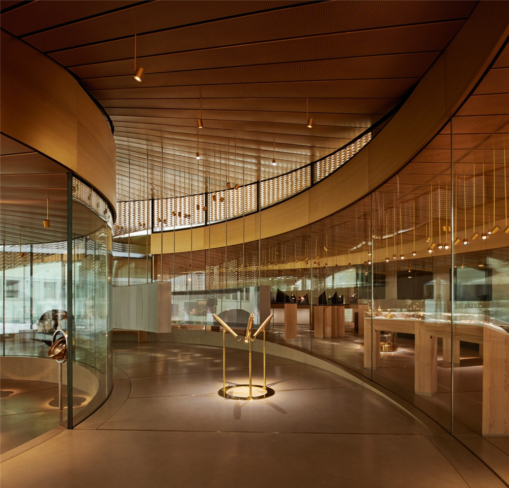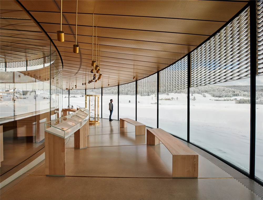 爱彼博物馆Musée Atelier的螺旋式展馆由丹麦BIG建筑公司设计、瑞士CCHE建筑公司建造,破土而出的弧面玻璃幕墙与自然景观和谐融为一体。这是位于汝山谷这种高海拔地区的首座玻璃幕墙建筑,攻克了工程学与美学设计的双重挑战,钢结构屋顶的重量完全由弧面玻璃板支撑,外侧的黄铜材质网栅具有调节光线和温度的功能。绿化草坪屋顶可进一步调节馆内温度,并吸收雨水。