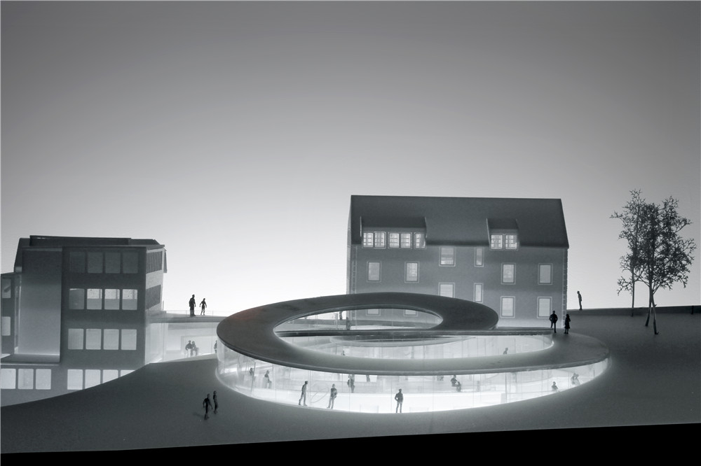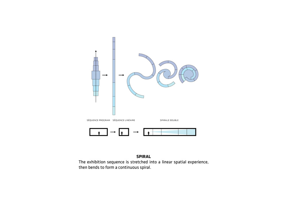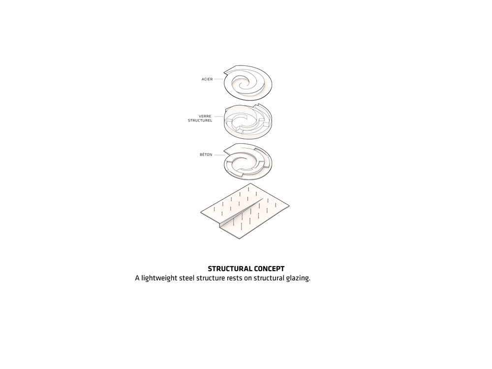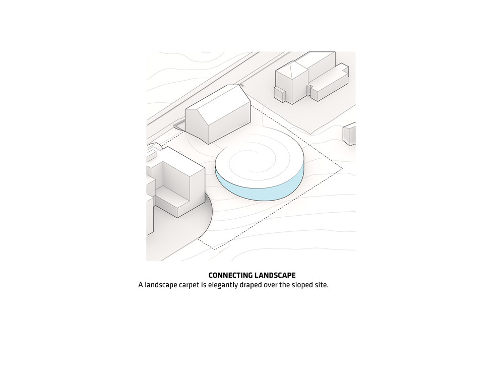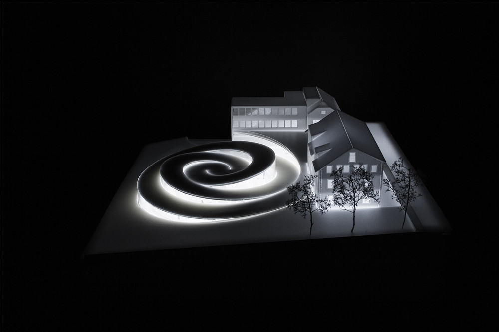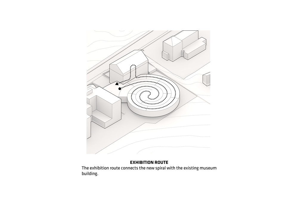 The spiral has been designed to perfectly integrate the surrounding landscape. The floors follow different slants to adapt to the natural gradient of the land and provide the basis of the museum’s inner layout stretched into a linear continuous spatial experience. Inside, the curved glass walls converge clockwise towards the spiral’s centre, before moving in the opposite direction: visitors travel through the building as they would through the spring of a timepiece.