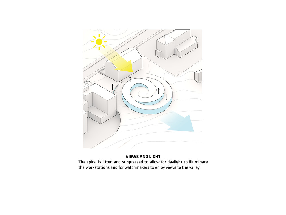螺旋式展馆经过精心设计,与自然景观融为一体。为配合所在地势的天然坡度,馆内地面呈现斜坡,并以此为基础将室内空间设计成螺旋状长廊。内侧的弧面玻璃墙沿着顺时针方向辐射至中心,再向反方向伸展,彷佛腕表机芯的发条结构幻化为一条时光隧道,观者流连其中,浑然忘我。