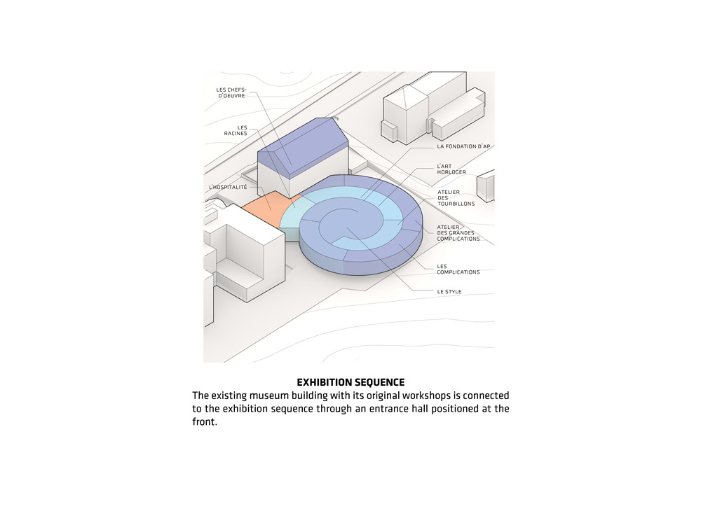 建筑采用玻璃幕墙的螺旋式展馆将引领观者走向古老木石结构的历史建筑。1875年,Jules Louis Audemards 与Edward Auguste Piguet就是在这座历史建筑采光良好的顶楼设立了首家工坊。这项革新工程汇聚了来自汝山谷的众多人才。瑞士CCHE建筑公司与汝山谷当地的能工巧匠及爱彼历史传承部门携手合作,着力恢复这一建于1868年的历史建筑。修复工作完全基于对历史文献的深入研究,例如内壁镶贴的木板,便是取自邻村古屋的雕花木板。