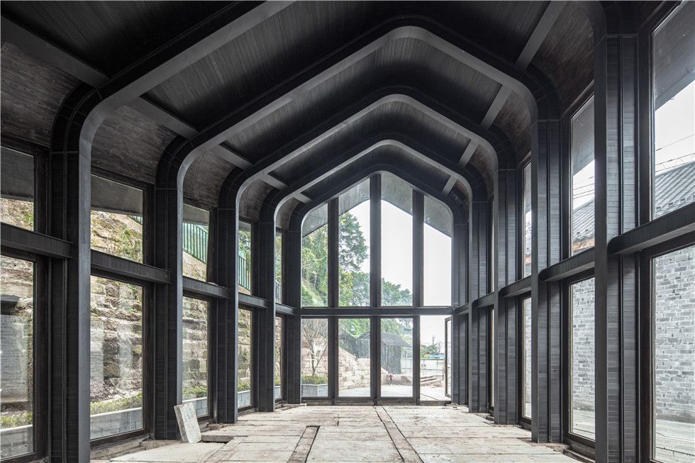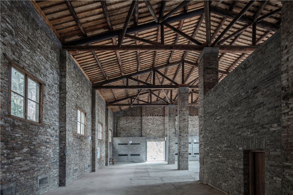 For the restored buildings No. 2, 3, 4, and 5, we repaired the brick walls and tile roofs and rebuilt the rammed earth walls with contemporary technology. For the renovated building No. 1, we restored the tile roof, kept the hollow brick walls and brick columns, and opened the elevation that faces the square and main entrance with glazed doors. For the rebuilt buildings No. 6, 7, and 8, we used slates on the roof and glass curtain walls to further increase the openness.