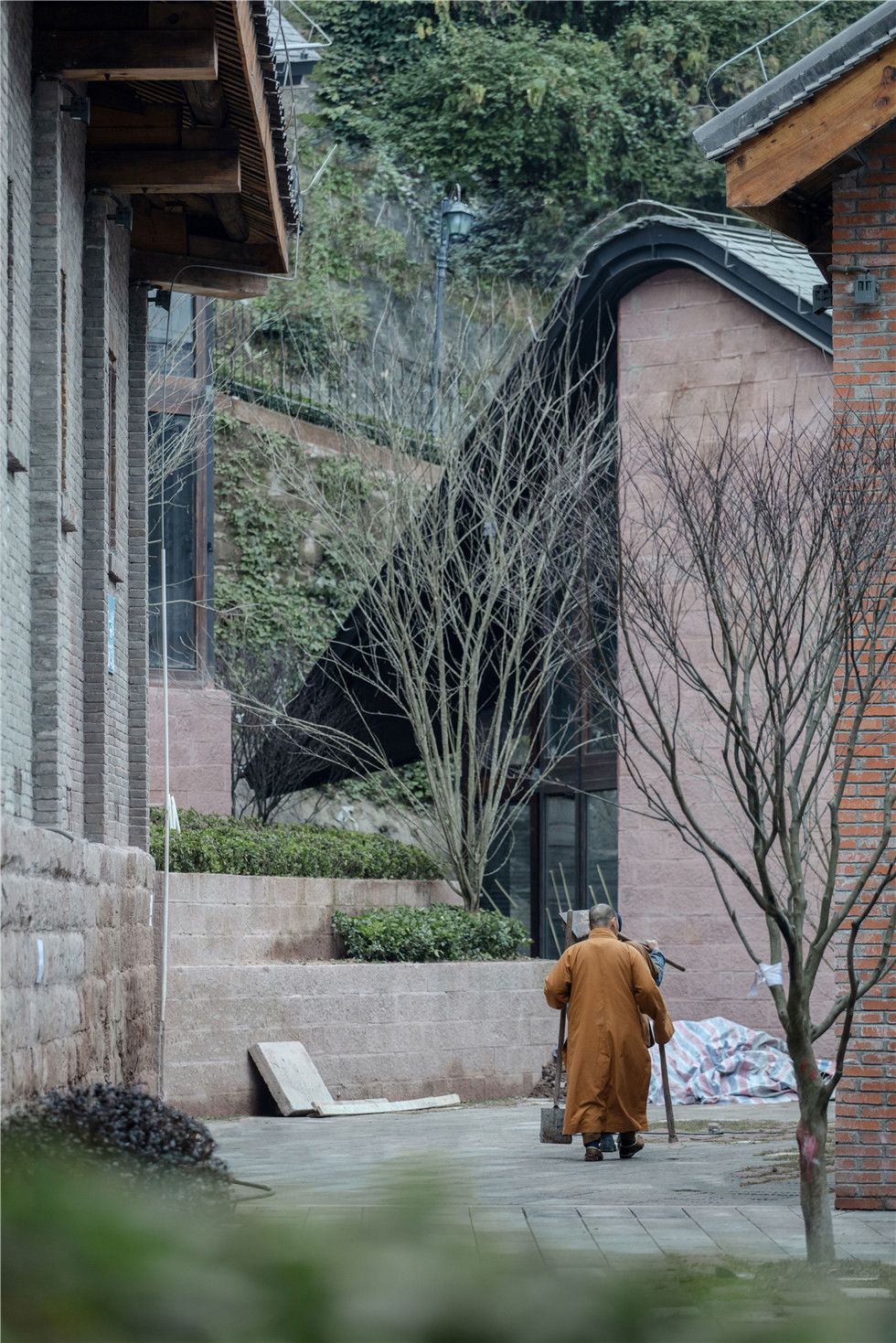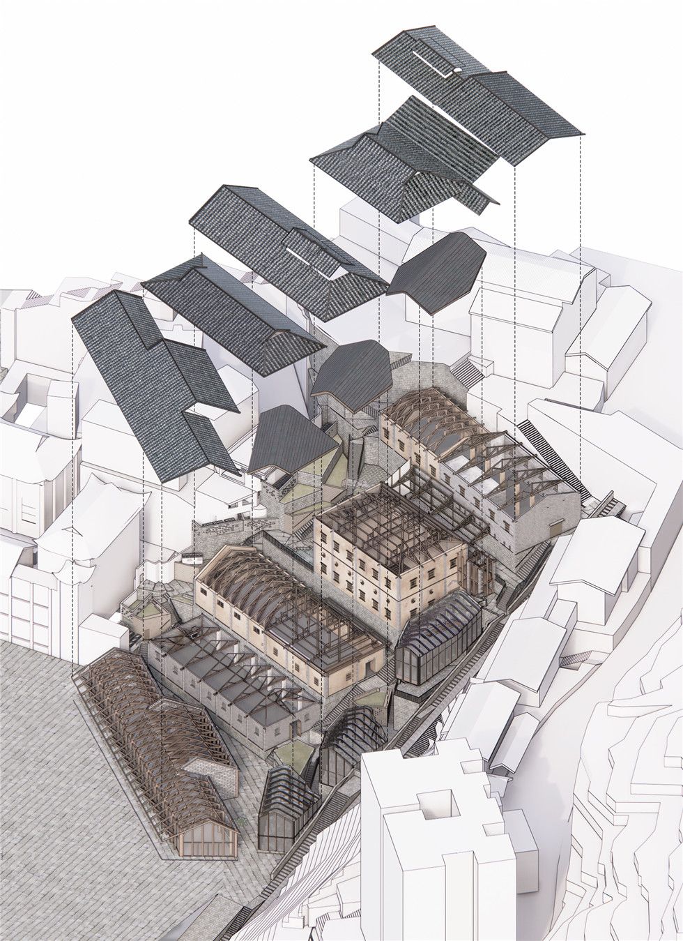 由于历史机缘,故宫学院重庆分院及南迁文物纪念馆将入驻于此。相关的展览活动,文化讲座,儿童教育,文创产品展示,工坊体验等都会在此展开。老建筑本身由于其所附带的文化属性、风格特征,也具有了展品的性质。在场地的流线设计中,设计团队也考虑了观赏建筑的视角,开辟出观景平台。建筑的屋檐出挑较大,形成了多个的半室外檐下空间,为交通路线、户外活动提供了遮蔽。现场遗留的缆车轨道、石阶、植被等,作为场地的记忆得以保留。