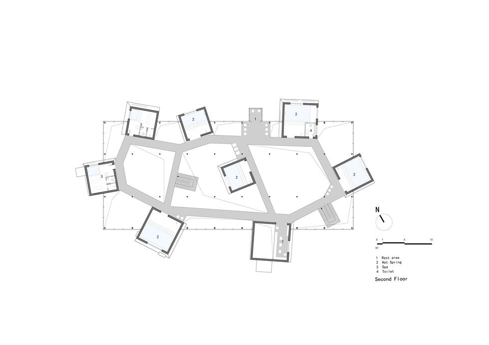 There are eight towers in total with different height and angles. The first floor at the two of the towers provide hot spring pools, while at the rest of the towers provide service spaces. The second floors at the eight towers are 2 spas, 5 pools and a rest space. Outside the towers, we design large open plant landscape areas covered in glass boxes.