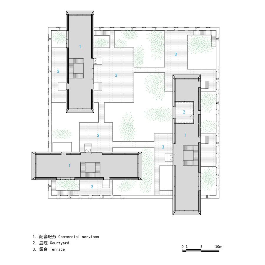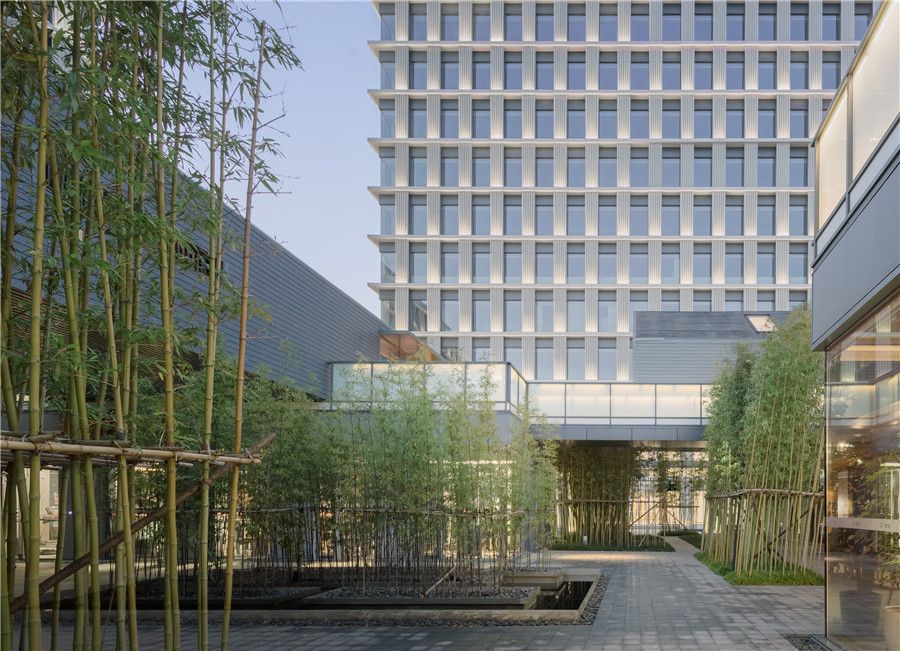 We keptthefacades of the commercial courtyard in consistency with that of theofficetowers, and designed them as translucent walls. This harmonizes theoutlook ofthe two-story commercial building with that of the office towers. Inthecommercial courtyard, convenient stores, coffee shops, joint offices andgymsoccupy the “boxes” on the ground floor and the “cottages” on the firstfloor.With the bamboo courtyards and wooden terraces, the commercial courtyardboastsits friendly scale and natural environment and creates a complementaryandbalanced relationship with the office towers.