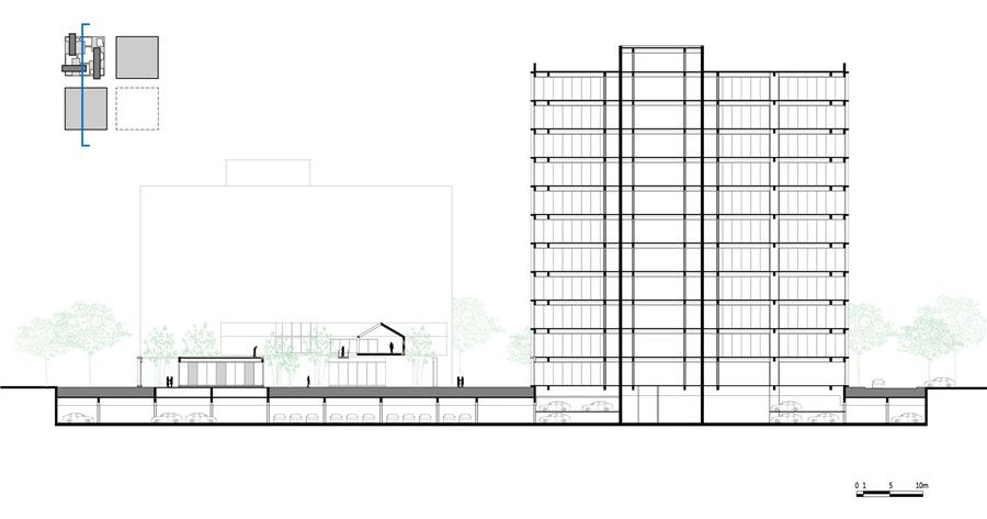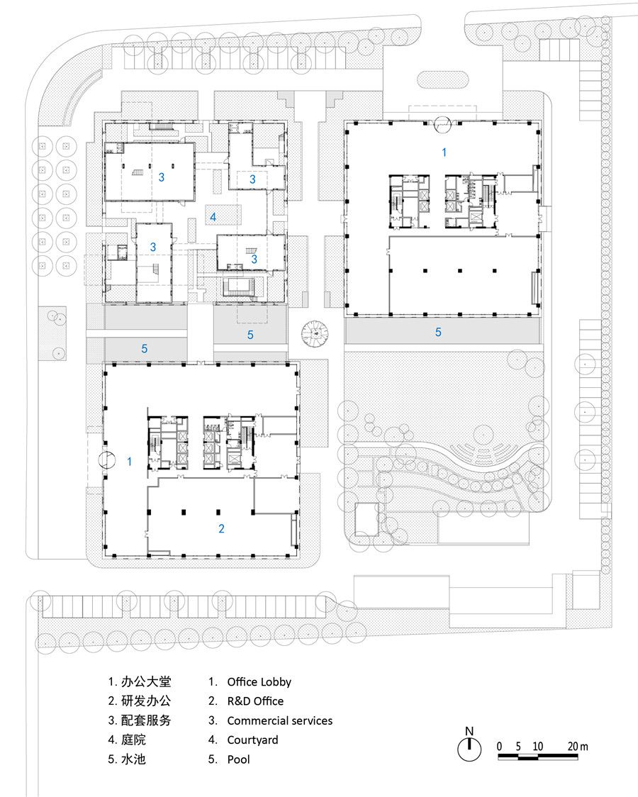 We avoided designinga podium to house the commercial facilities like many other typical officeprojects. On the contrary, we separate the office tower and the commercialfacility. Standing independently, the commercial building can offer a spatialexperience that is different and complementary to that of the office tower. Therefore,the square site is quartered, and two office towers sit at the north-east and the south-west corner and semi-enclose the other two corners. The south-east corneris unoccupied and serves as a public green space, and the north-west corner is occupiedby the commercial courtyard.