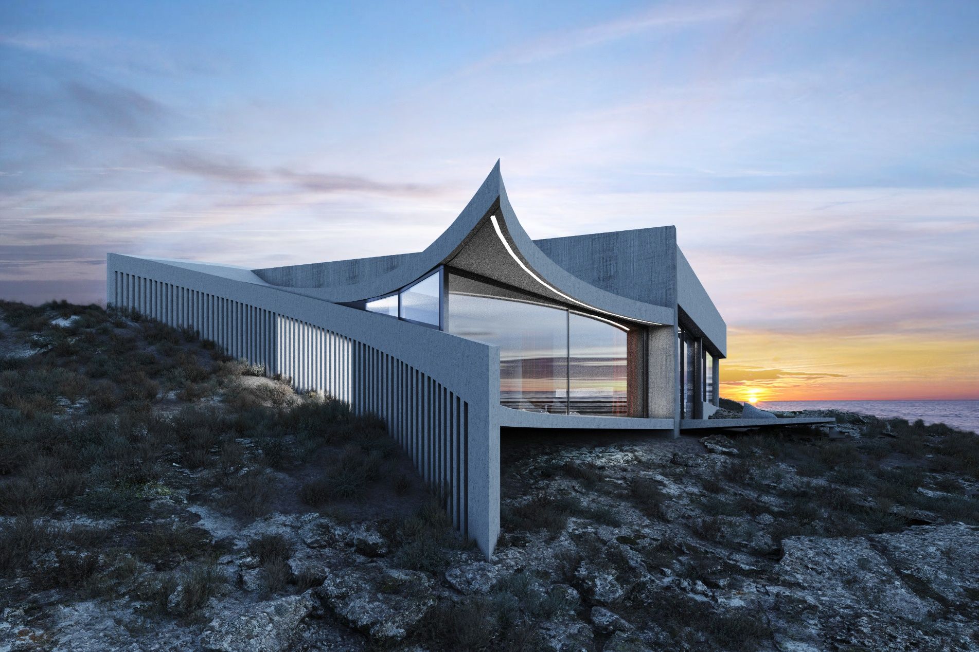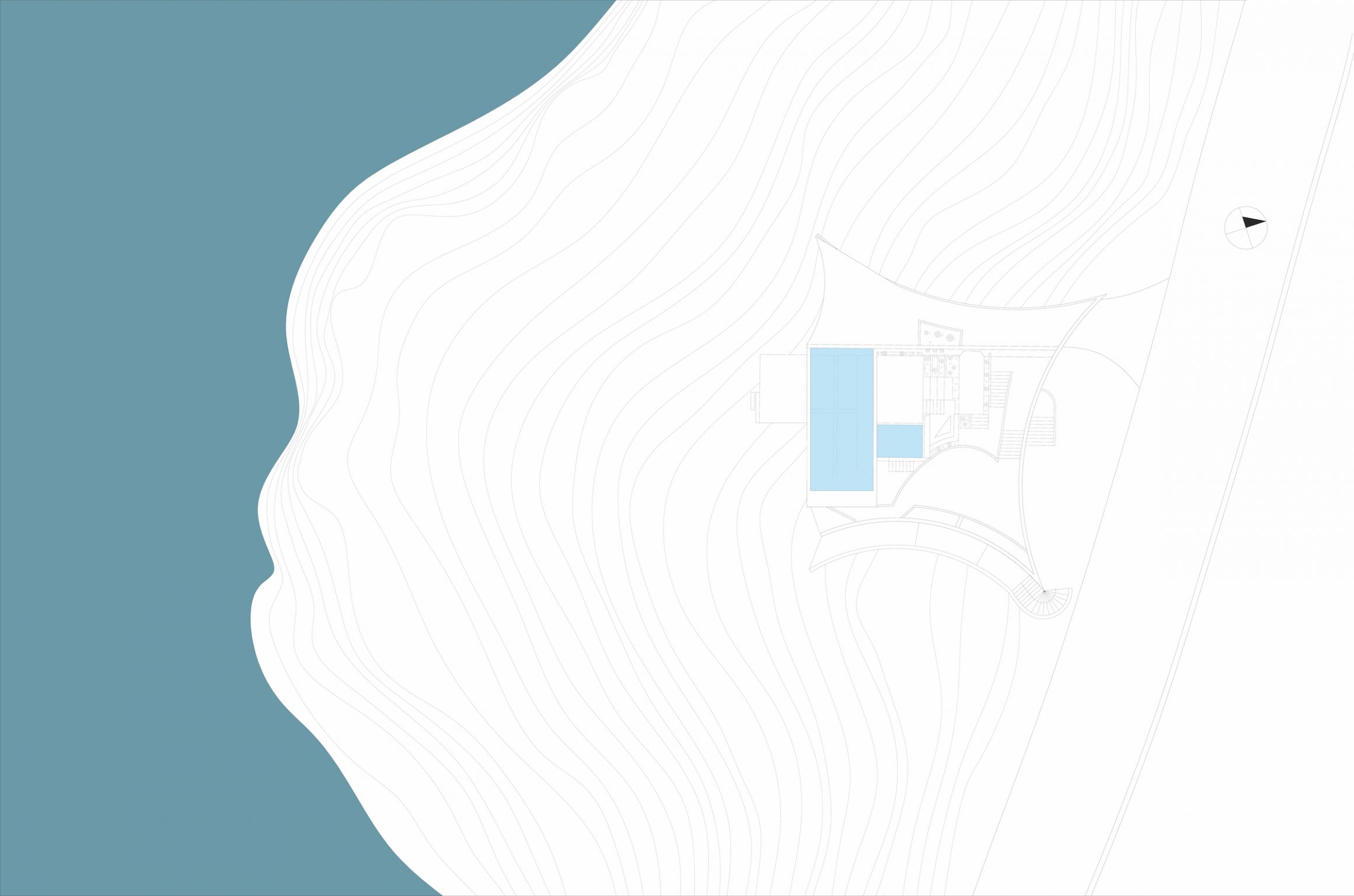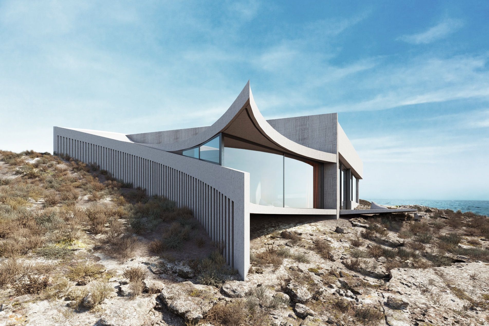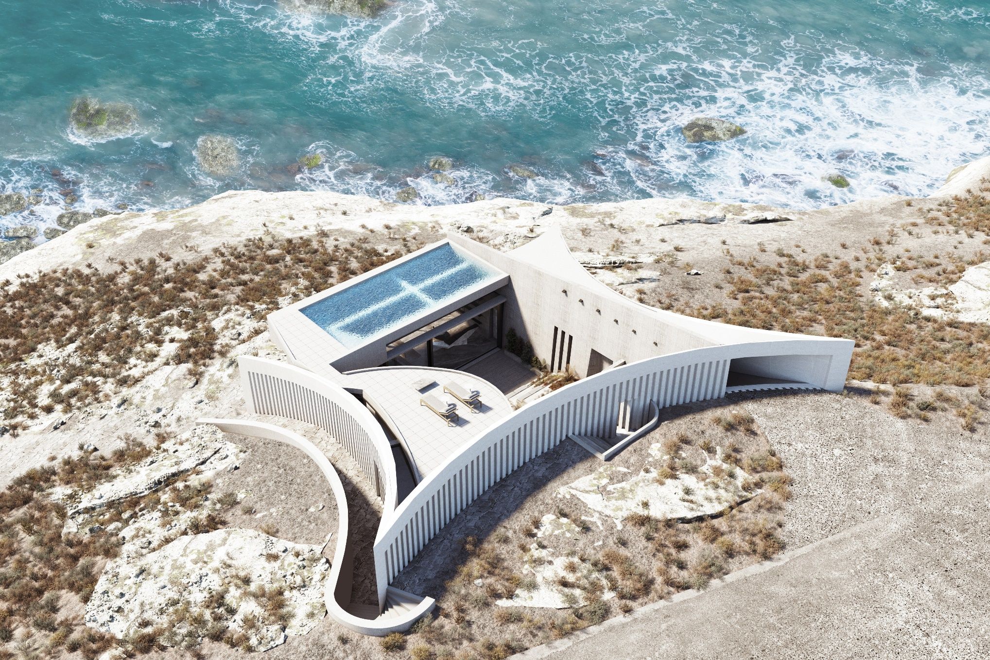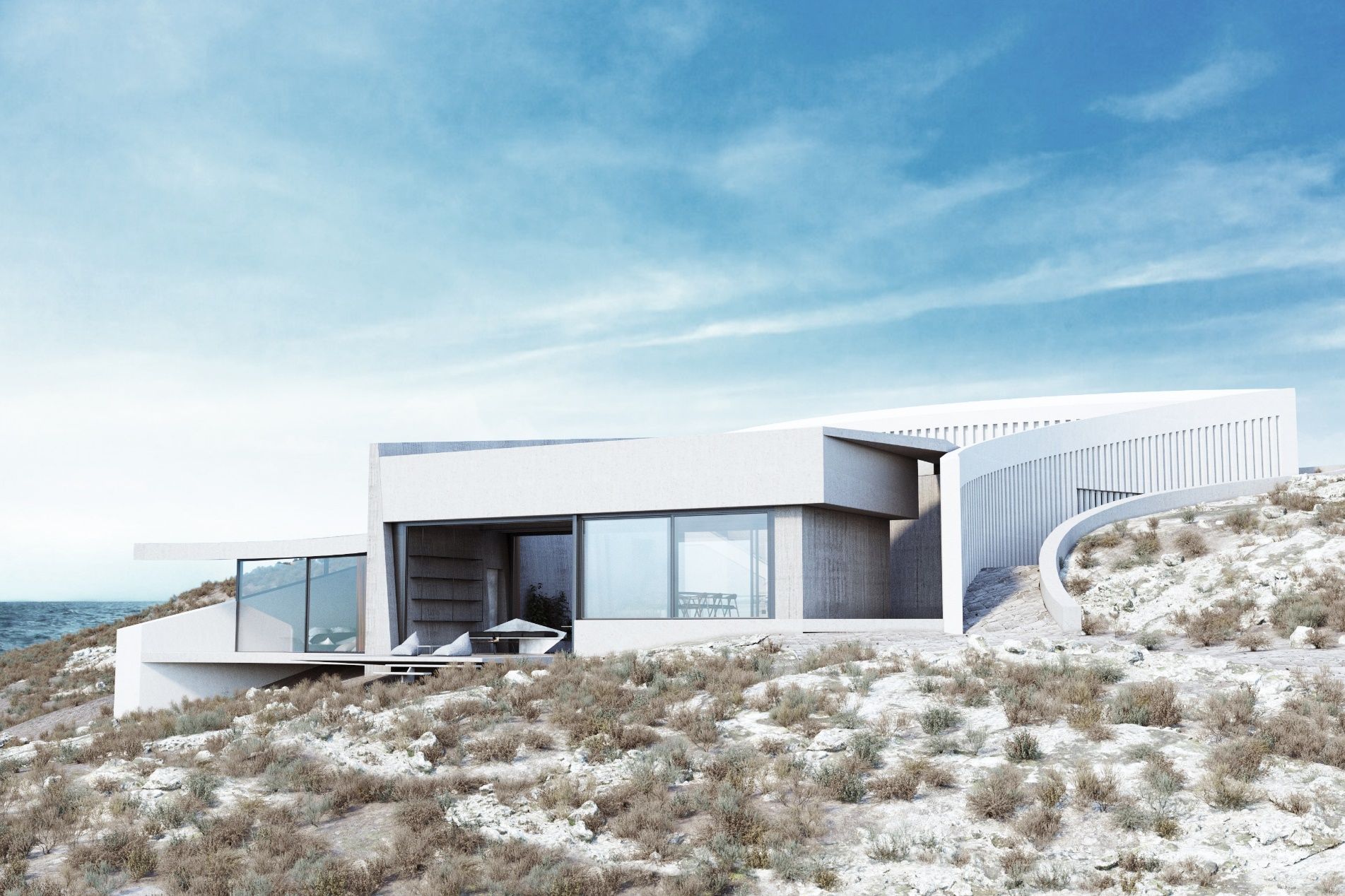 The section of the house creates a microcosm of spaces and movements, forming a path that bypasses enclosed spaces and ends up outside the residence. In this way, the visitor can access the sea in front of the residence directly from the central private patio. The morphology of the volumes expresses each separate function. The rough materials are in dialogue with the topos. The separate volumes are embraced by a curved, unifying skin that holds the whole building together and forms an acute, yet silent gesture of intervention on the untouched mediterranean landscape.