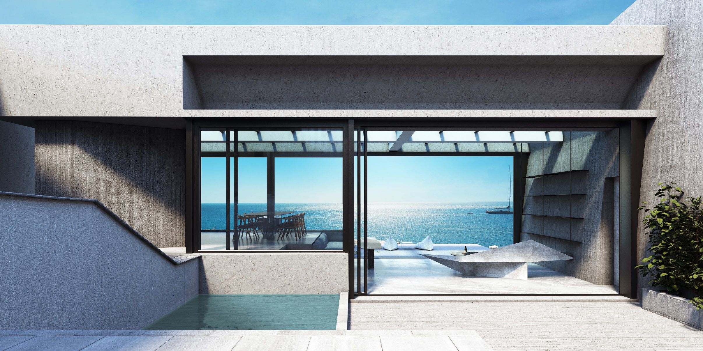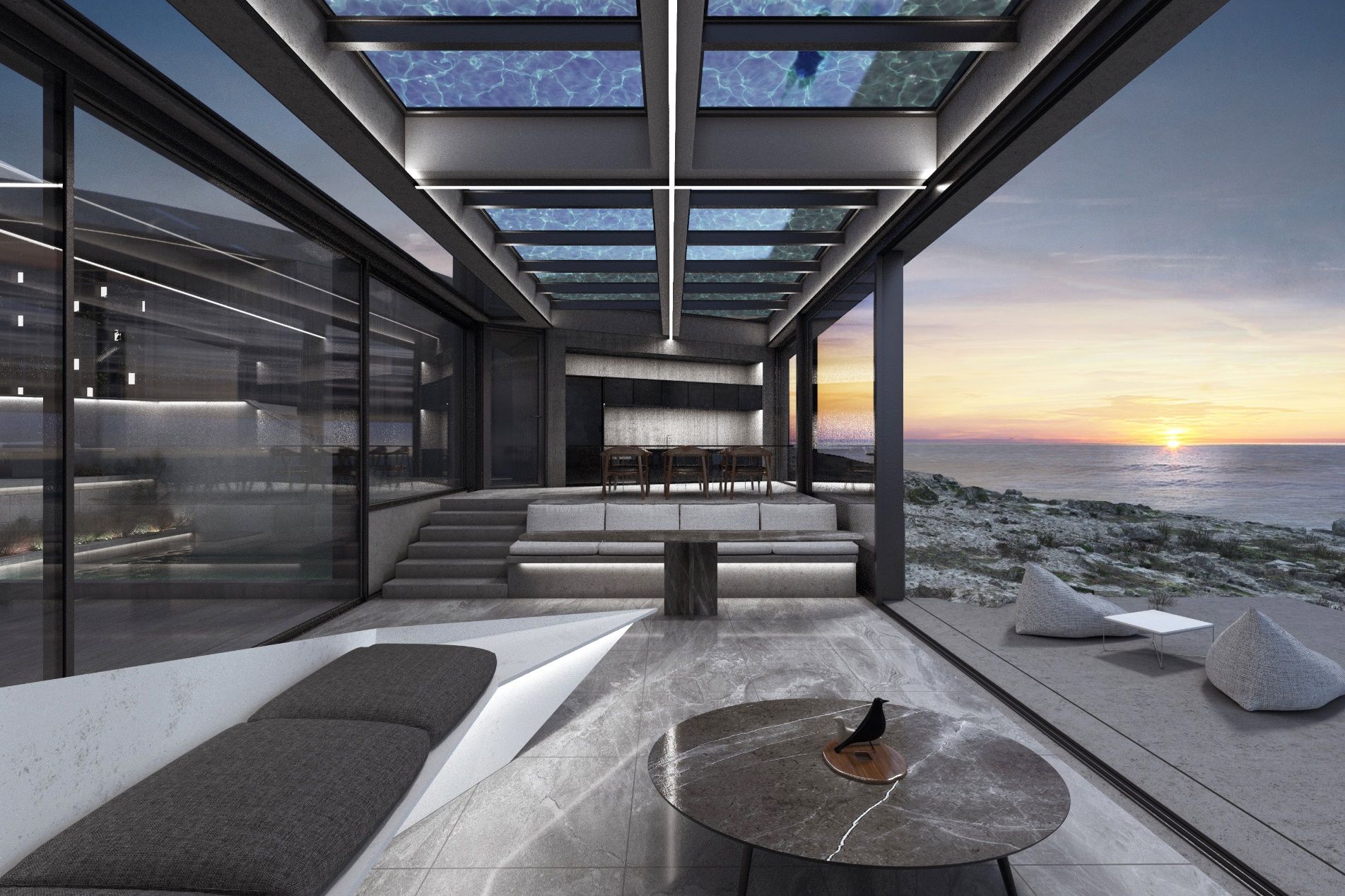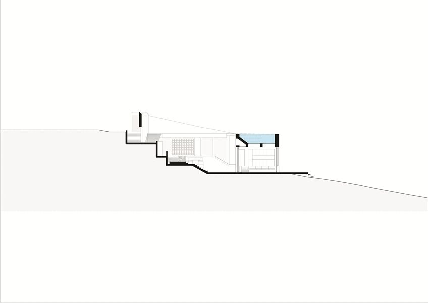 The house is organized around a patio oriented accordingly to tackle the factors of view and daylight. The natural terrain and the views of the land were elements crucial to the design. The visitor enters from the patio’s highest point. There, the movements are distributed around the three zones of the house – the master bedroom, the guest rooms and lounge area - and the swimming pool. The patio follows the sloping terrain and descends gradually through a path of terraces and seating areas leading the visitor to the view. Its final level, in combination with the airy living room, constitutes an expanded covered balcony. Its transparent roof bears the pool-observatory. The patio and pool function as vital living spaces. The bedrooms maintain their privacy while also referring to the patio and the sea view.
