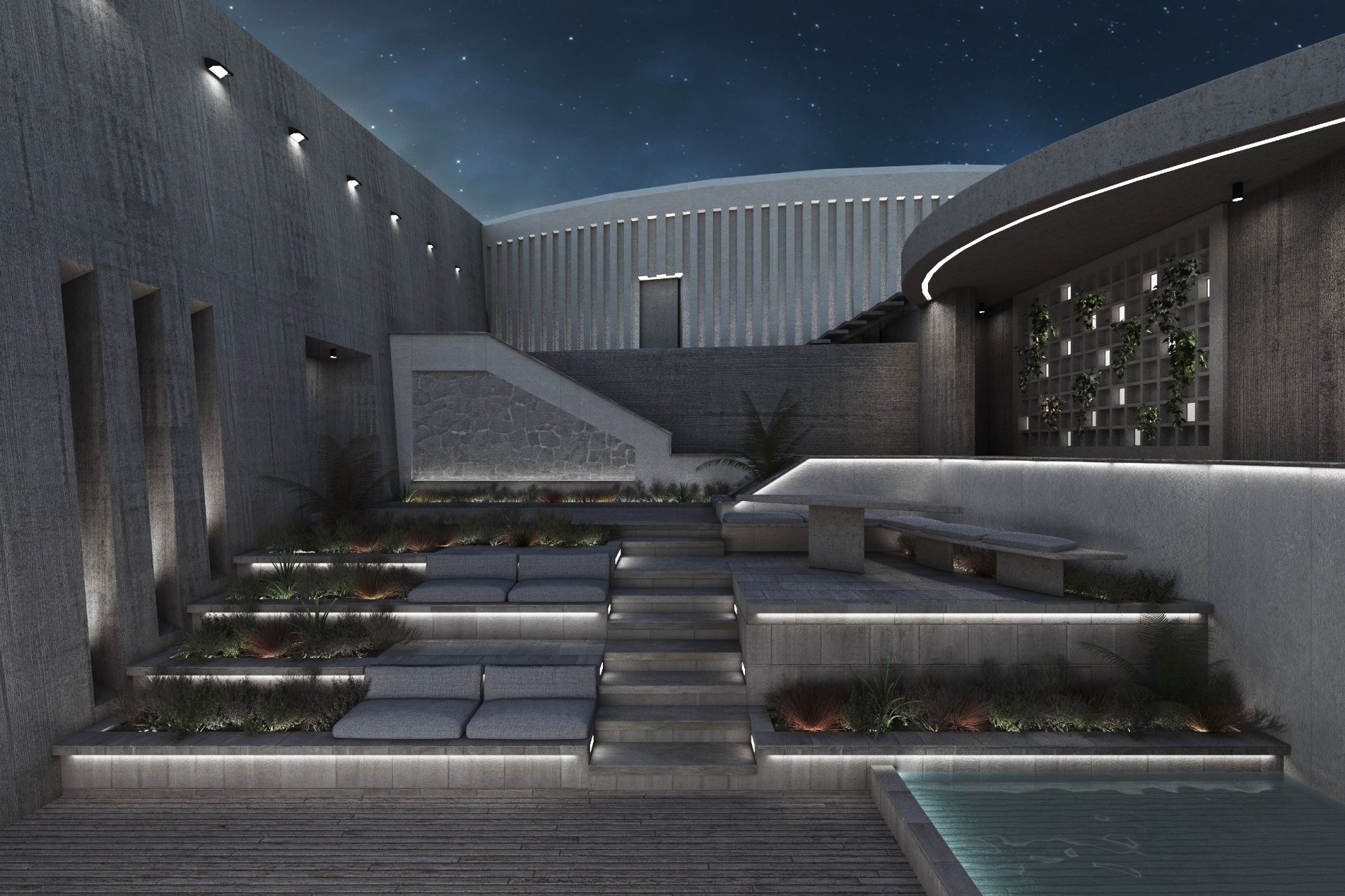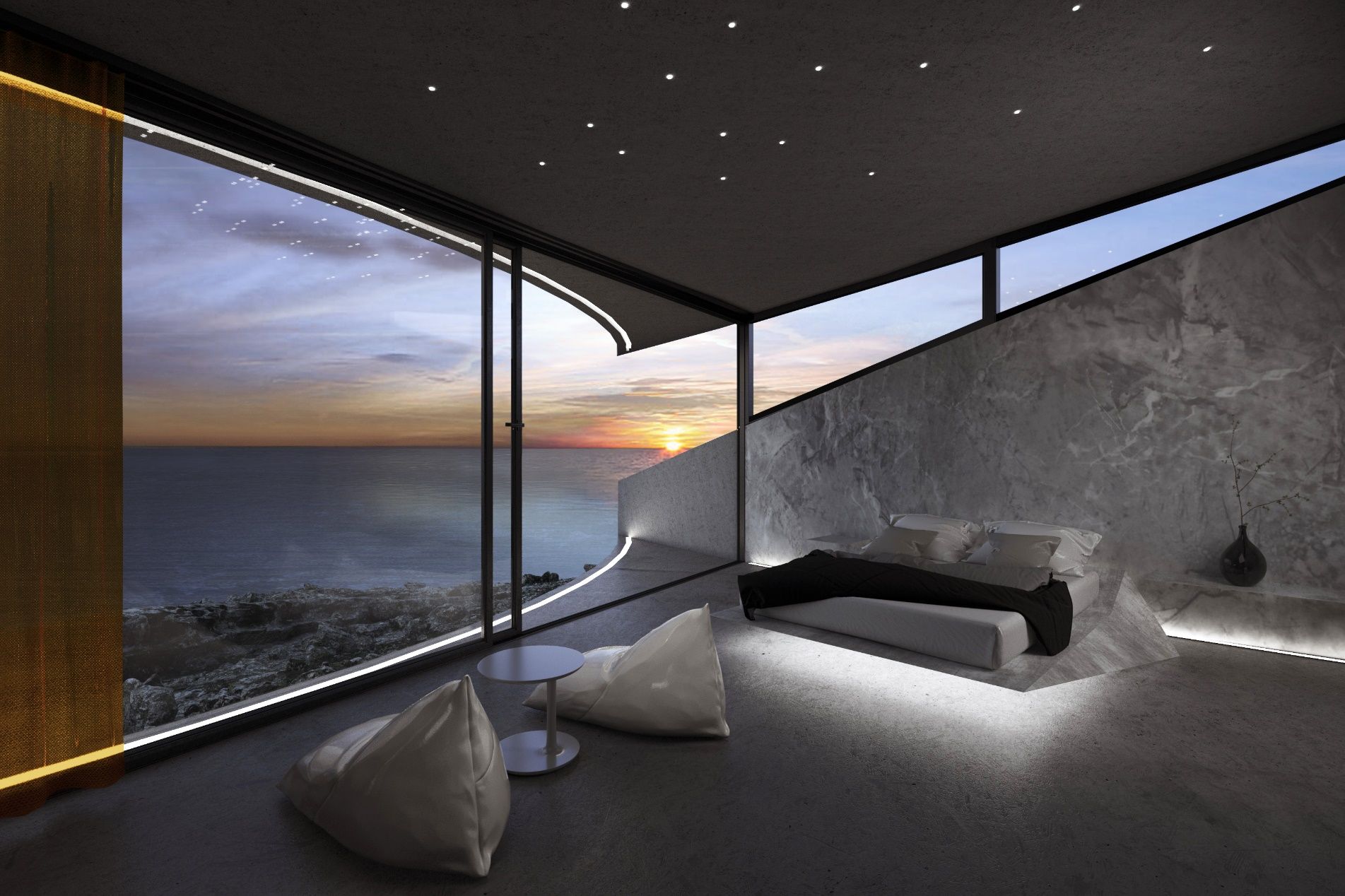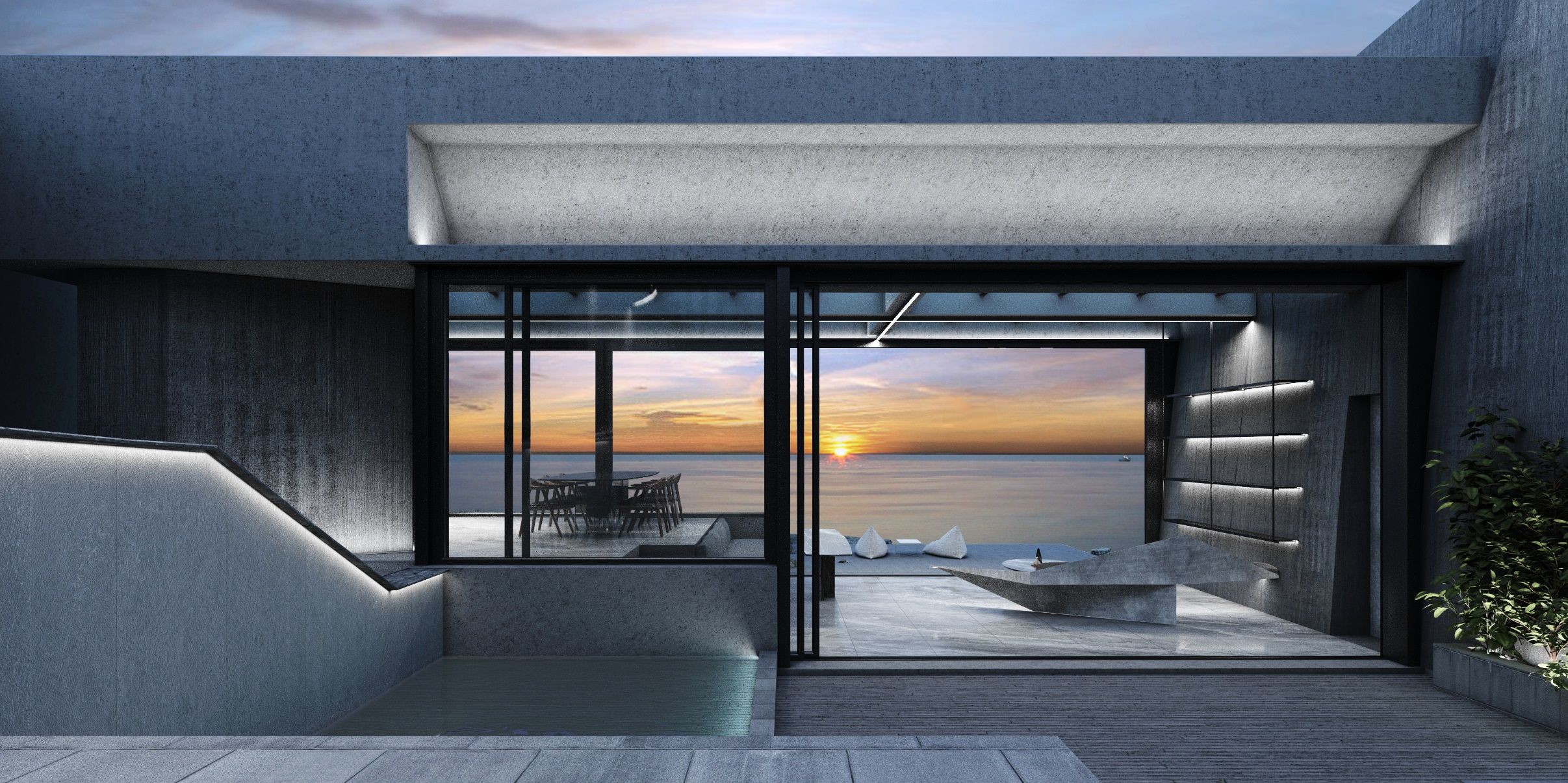 The house is organized around a patio oriented accordingly to tackle the factors of view and daylight. The natural terrain and the views of the land were elements crucial to the design. The visitor enters from the patio’s highest point. There, the movements are distributed around the three zones of the house – the master bedroom, the guest rooms and lounge area - and the swimming pool. The patio follows the sloping terrain and descends gradually through a path of terraces and seating areas leading the visitor to the view. Its final level, in combination with the airy living room, constitutes an expanded covered balcony. Its transparent roof bears the pool-observatory. The patio and pool function as vital living spaces. The bedrooms maintain their privacy while also referring to the patio and the sea view.