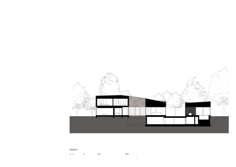 The ground floor consists of three main zones – the living area with an open kitchen, a wellness zone with swimming pool and sauna, and a resting wing with bedrooms and music room offering panoramic view over the water. On the first floor is the master suite with views of the tree crowns and a library overlooking the pond through the double height music room.