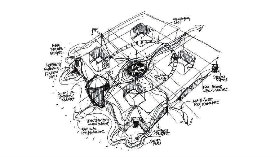 The existing building was four identical square blocks, 100m long by 90m wide, 5 levels above ground and 2 levels below, a total of 280,000sqm of building area organized by cruciform shaped promenades. At the intersection was a majestic 1,900sqm circular plaza capped with a domed skylight. Meanwhile, the facade was composed of identical square boxes all around which was quite easy to lose direction in such symmetry and lack of hierarchy.