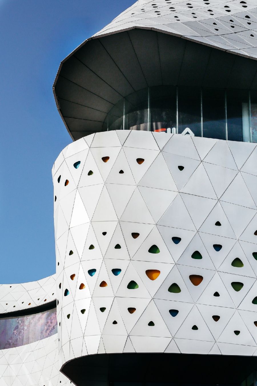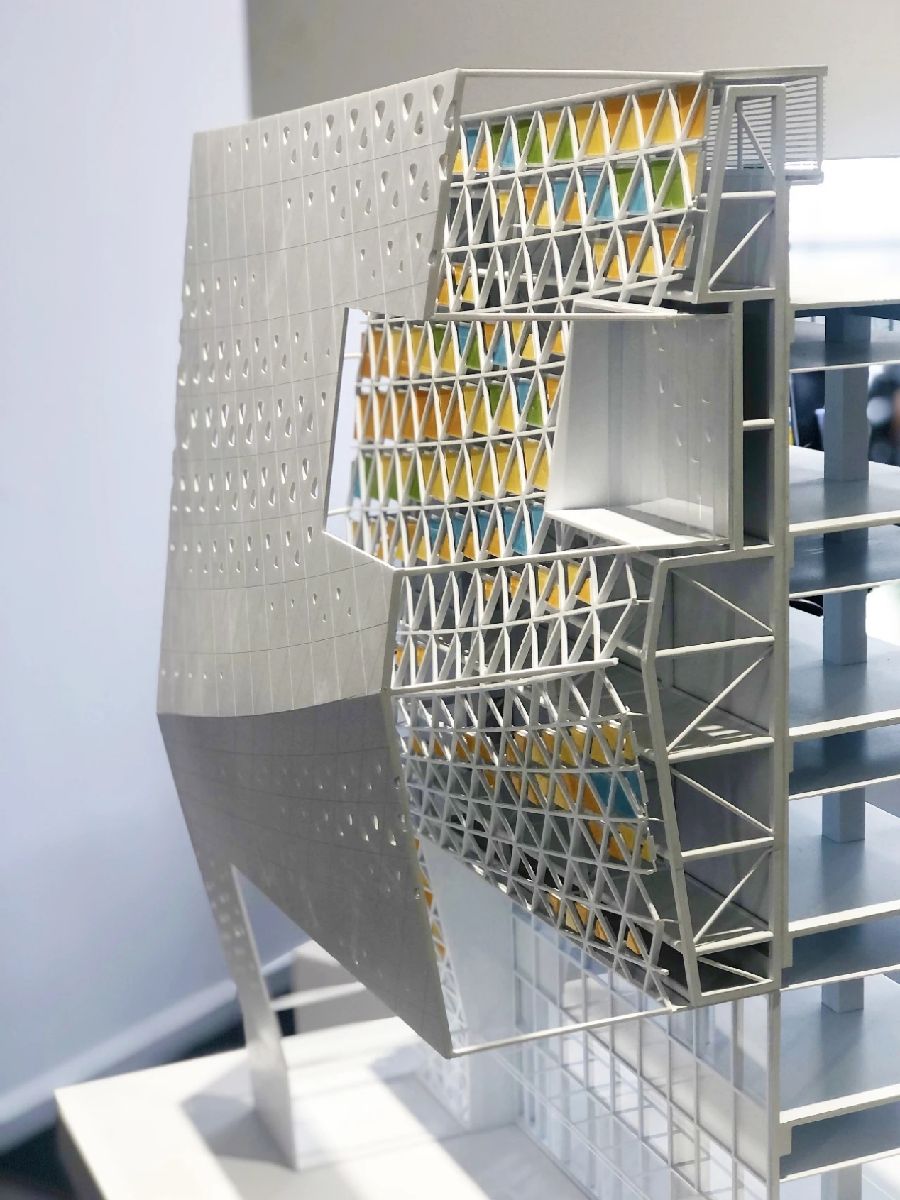 外立面设计利用建筑数字化表达“蝶变”的概念,在整体外立面设计运用尺寸不一样的白色三角铝板,创造了统一简洁的流线造型外立面,再结合蝴蝶本身的图案纹路特征,数字化逻辑去筛选3000多个铝板作渐变穿孔,置入5种颜色匹配的半透明树脂灯箱,为建筑立面创造更丰富的层次,模拟了“翩翩起舞”的动态与“色彩斑斓”的调性。在每个灯箱中设置单点可控的LED光源以实现柔和可变的灯光动态氛围,使得在夜景中也能增加立面的温度、动感与活力,形成独特的气质和印象,为城市带来焕然一新的面貌。