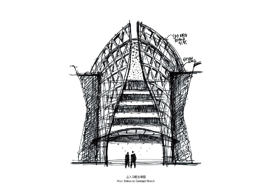 沿西湾路的主立面长达200多米,建筑退让道路约20米,形成大型的城市广场。我们在西立面正中嵌入巨型对称的弧形玻璃体,倾斜悬挑并凸出整体外幕墙。在玻璃内侧结合轻盈的格栅LED屏幕,极具昭示感地屹立在主广场。