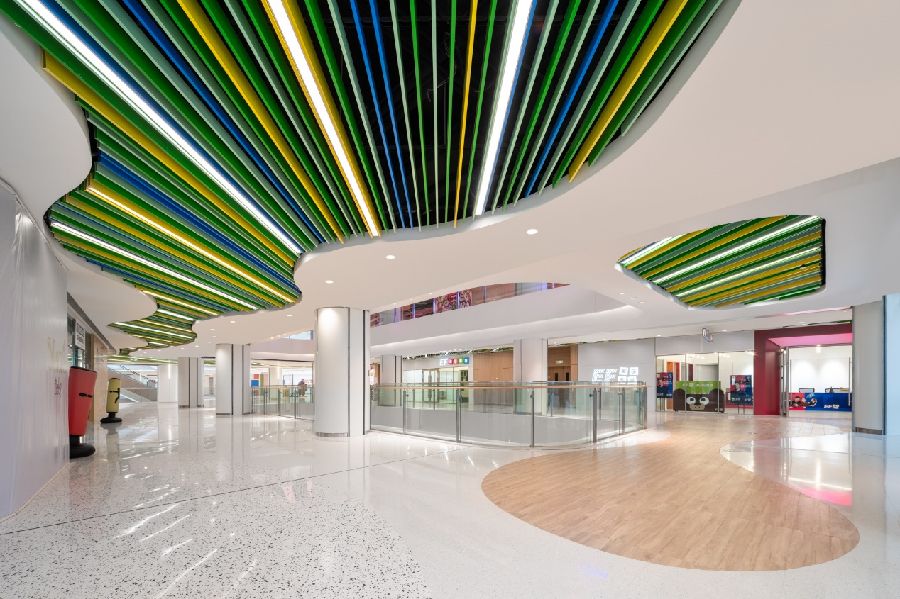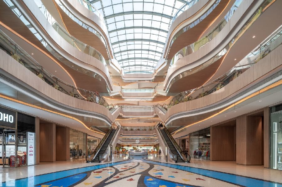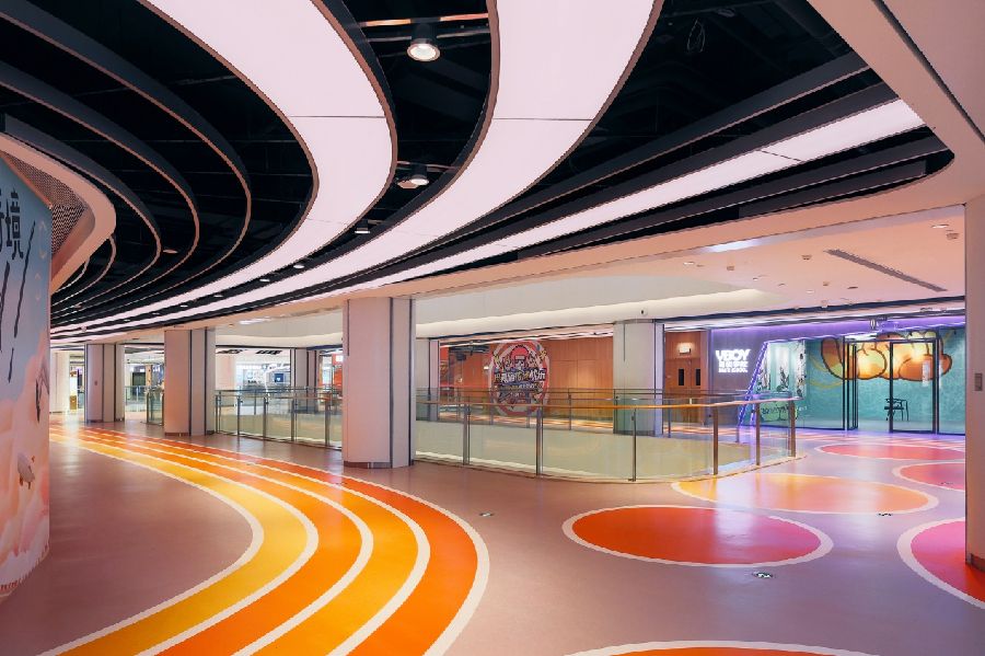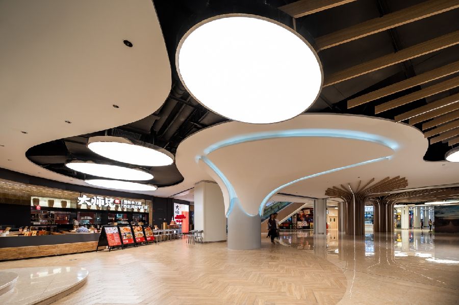 整体室内色调以浅暖色橡木和白色为主,天花和地面采用弧线条设计语言,制造引导性,也柔化了原有建筑方正的空间感受。利用主次空间的串联叠加,各种类型业态的分区组合,创造出丰富的主题区,带来兴致盎然的购物体验。