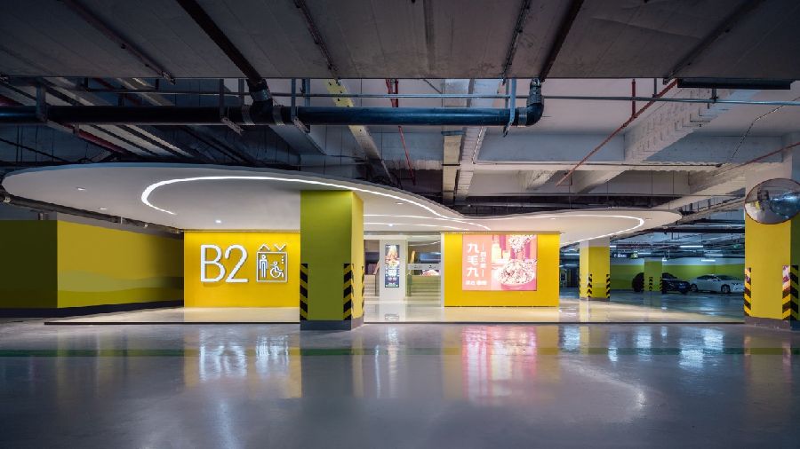 ▲停车库电梯厅利用亮眼的色彩、灯光和标识,顾客可方便快捷找到 © 吴鉴泉