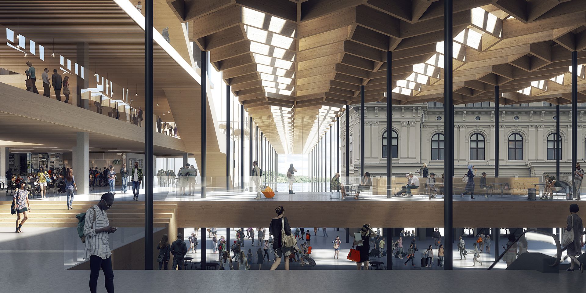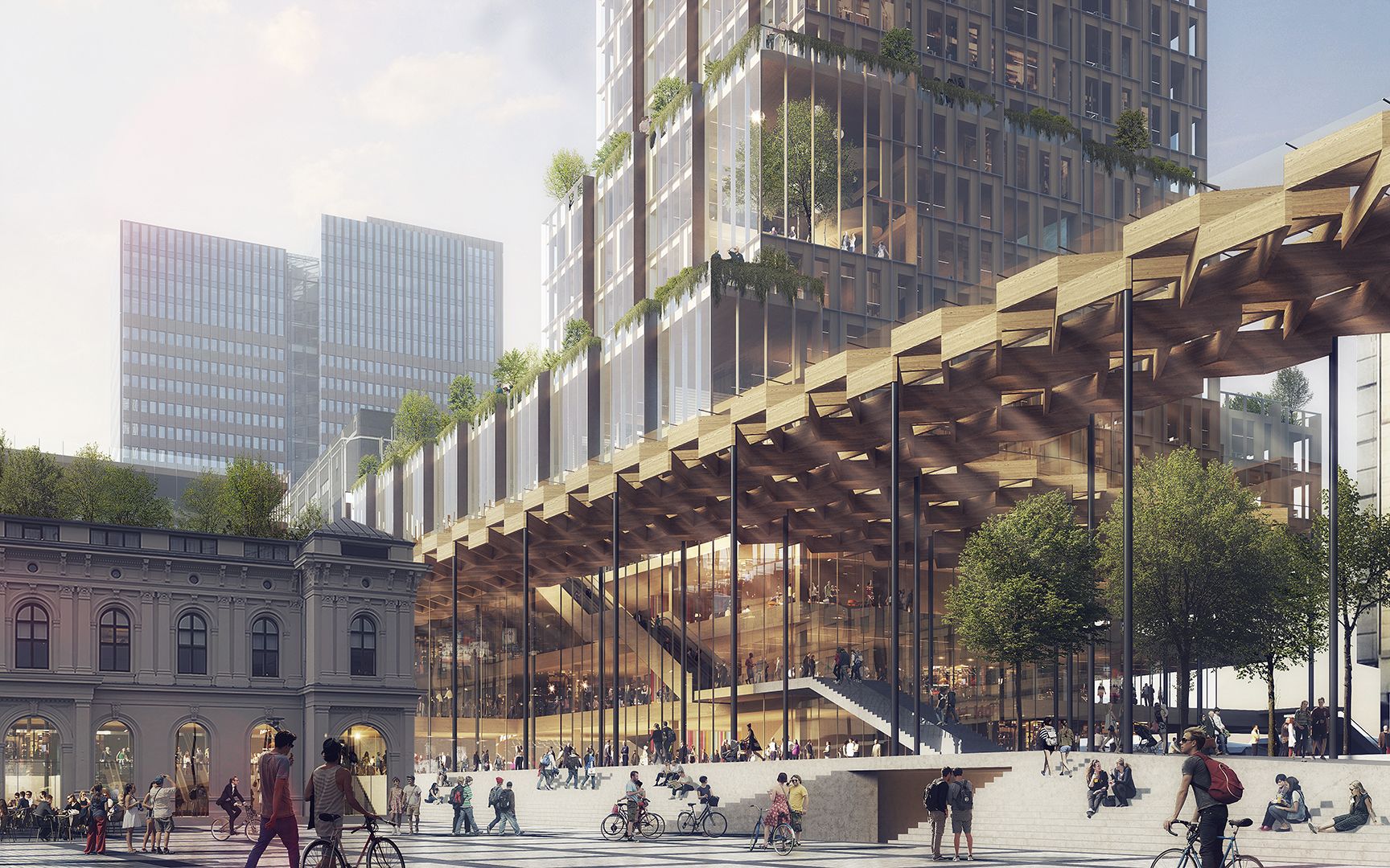 At the base, areas have been created that make it easy to find one’s way around. The building structure is clearly evident and facilitates smooth transfers between the various means of transport. A wooden pergola of lightweight mesh structures defines the central railway station's new main entrance, while spacious amphistairs connect the area to Østbanehallen’s food market. Outdoor atriums and roof lights ensure optimal daylight conditions in the base.
