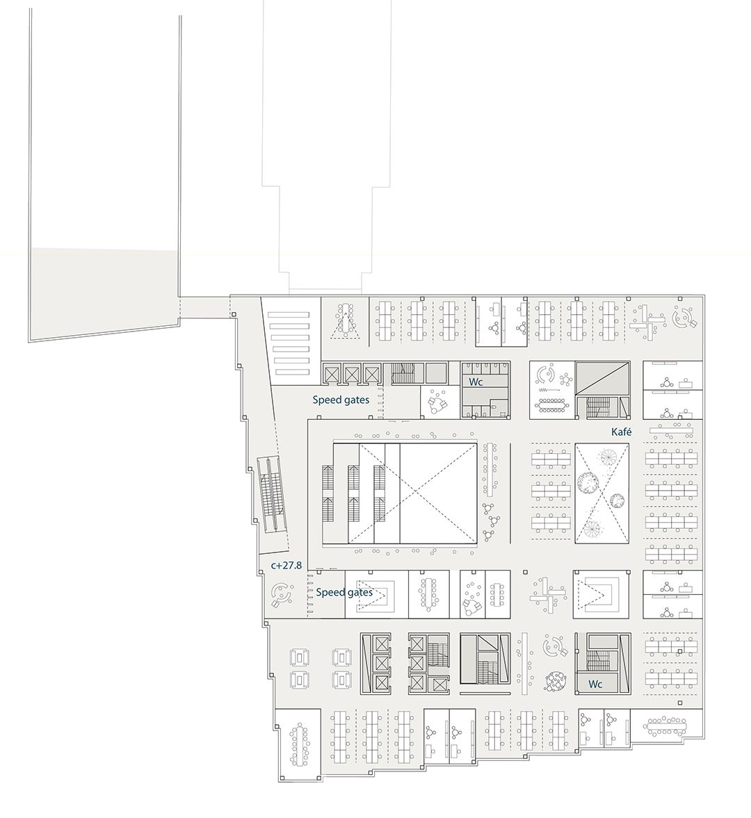 The tower is bathed in daylight. The workspaces have shared infrastructure, break rooms and informal meeting places to facilitate a flexible, mobile working life. "Green lungs" in the form of vertical connections across multiple levels and terraces with vegetation provide ample contact with the city and its landscape.