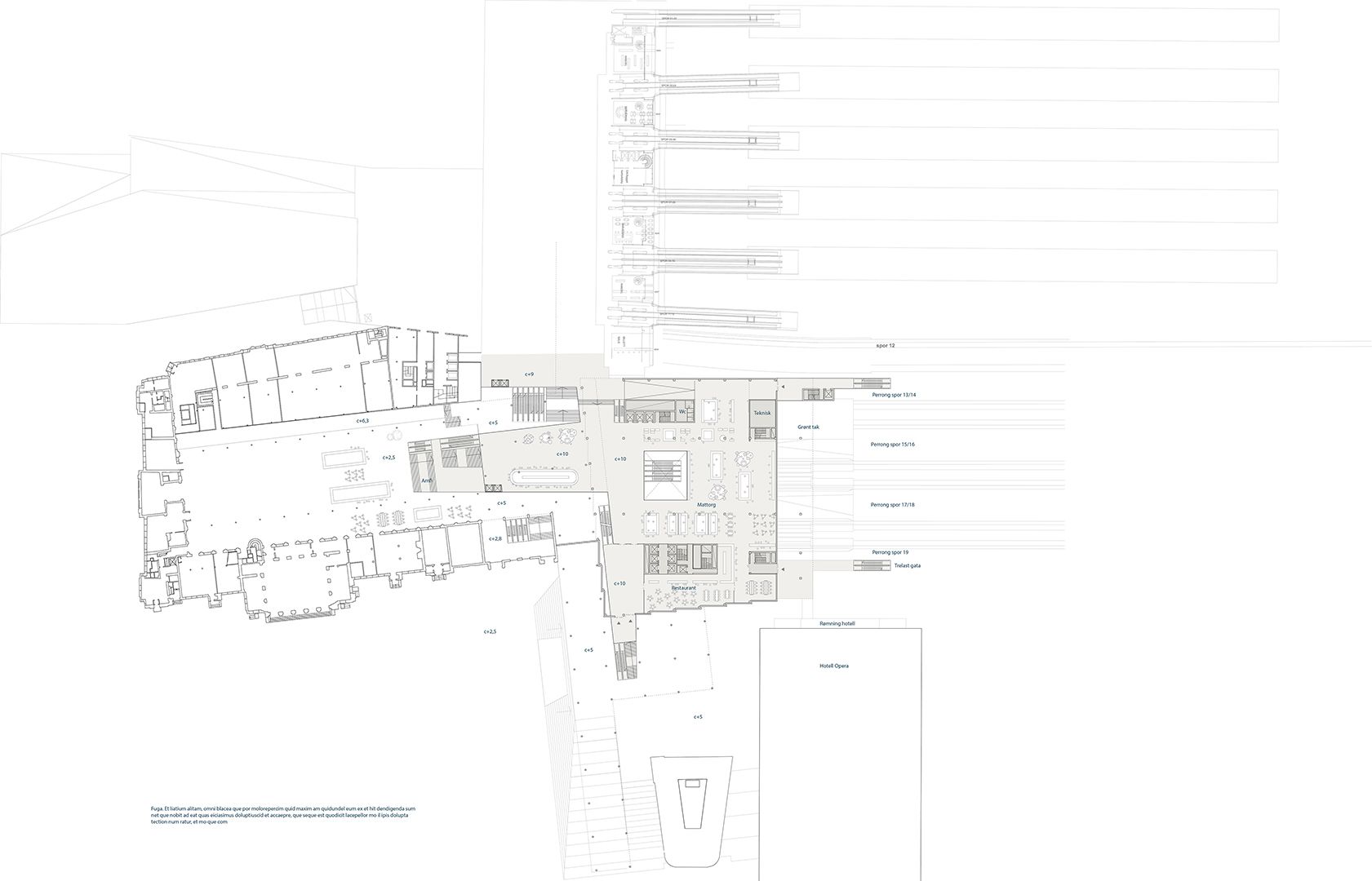基底的区域划分使人清晰易懂,方便穿梭通行。建筑结构也非常明显,有利于各种交通工具的便捷换乘。轻质网状结构的木制棚架是中央火车站的新主入口,而宽敞的台阶通向Østbanehallen美食广场。室外中庭和采光天窗确保了最佳采光。