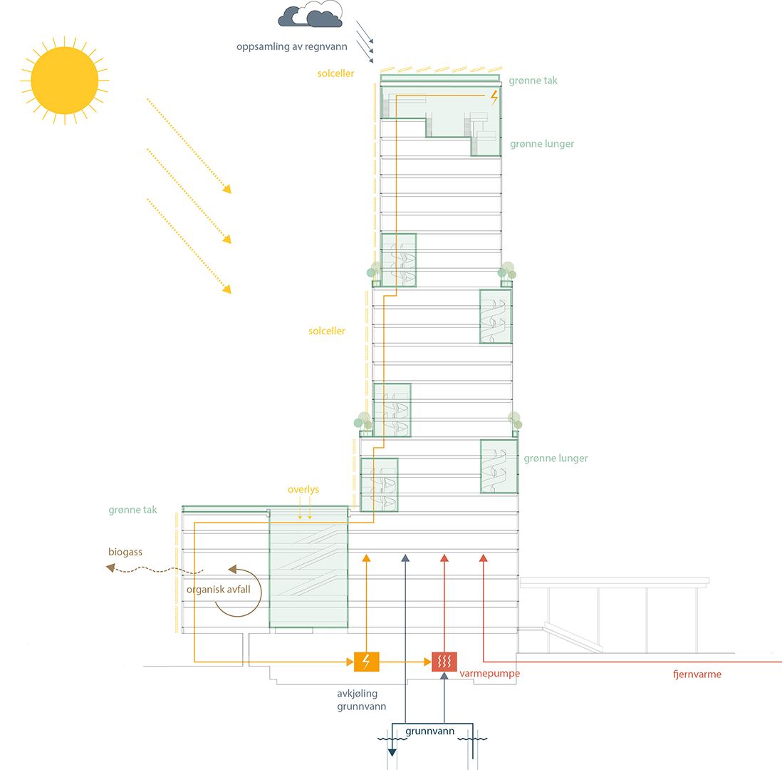 Fjordporten comprises a tower with a base. The tower mainly houses offices, while the base contains service functions for transport users. The building volume interacts with the towering "cathedral space" in the existing Østbanehallen and tapers downwards with inspiration from Oslo's landscape and buildings. By combining the use of timber with modern materials such as concrete and high-tech glass, the building's materials are a subtle reference to the time when the city was built from wood.