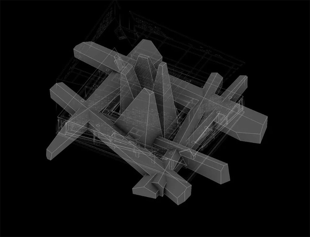 最终的改造呈现出这样一种形态,即之前横平竖直的楼板仿佛被多个晶锥方体穿透,原本正交系统的梁柱空间被转换成一个个神秘发光的晶体空间,当这些沉重的物体漂浮起来时,反重力空间将观众置于一个未知的空间中,仿佛直接来自一部科幻电影。