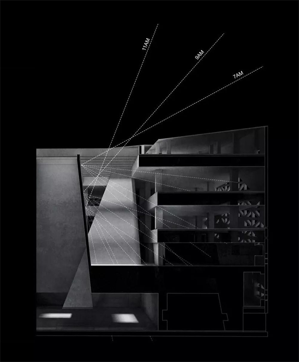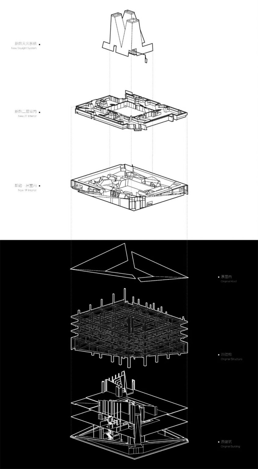 在对原有的办公楼空间的改造设计中包含了两个巨大的挑战:第一,如何区隔和连接内部办公和开放展览这两种对立的功能空间;第二,原建筑办公区主要靠内部中庭采光,博物馆功能的介入势必使原先十分有限的办公采光更加紧张。