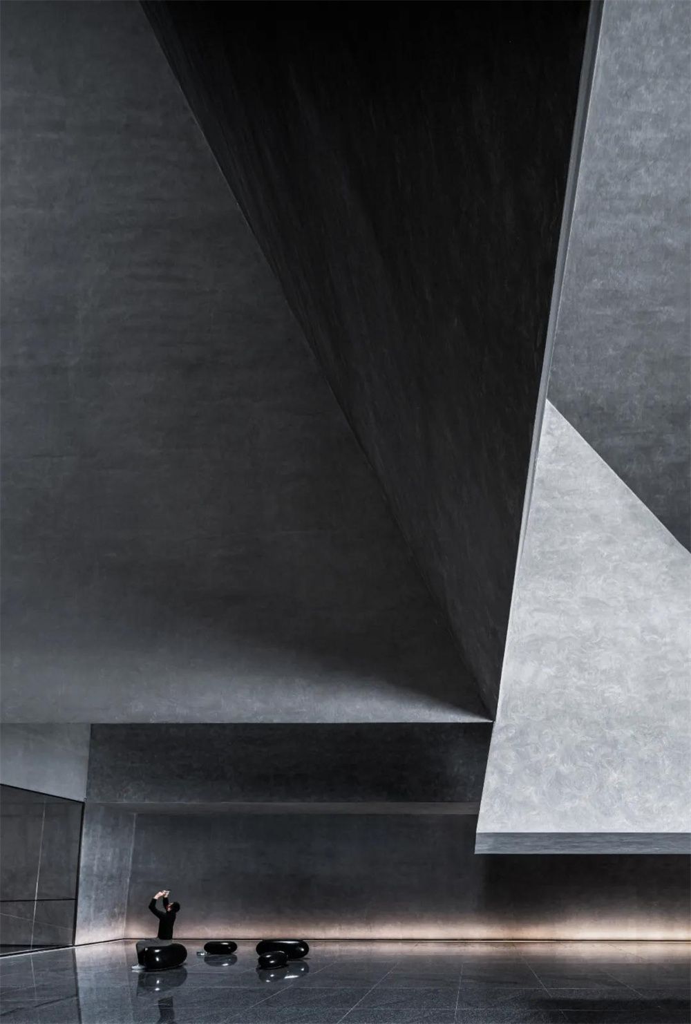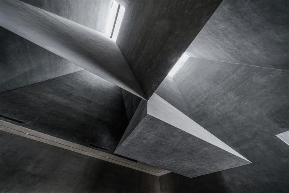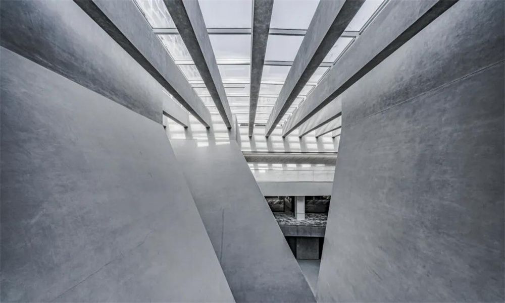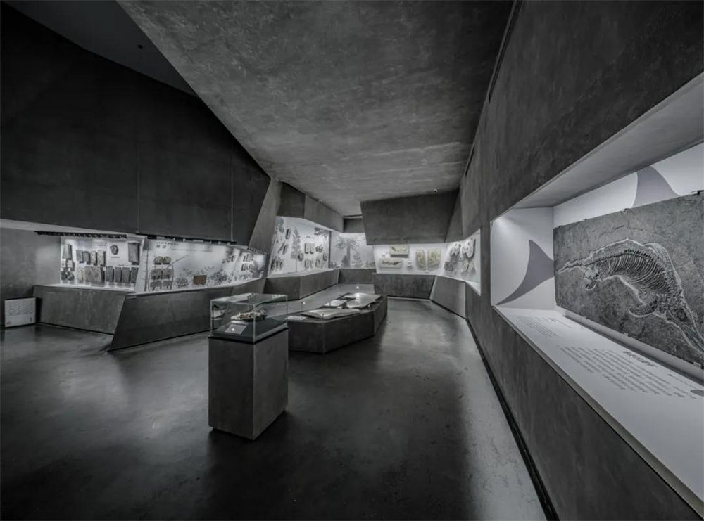 博物馆整个空间没有多余的装饰,用最原始的表达方式记录沉积亿万年的古生物印记,只使用了一个简单的构成元素——墙壁,这种简单性带来的是空间、尺度和光线体验的前置。墙壁不再仅仅是功能的分割界面,它的使用被重新创造:不仅带来平静冷峻的洞穴般的气氛衬托年代久远的地质化石展品;晶体的墙壁内部是博物馆的天花,墙壁外部承载了办公楼层的反光板功能,同时间隔了公共和私密两个分区。