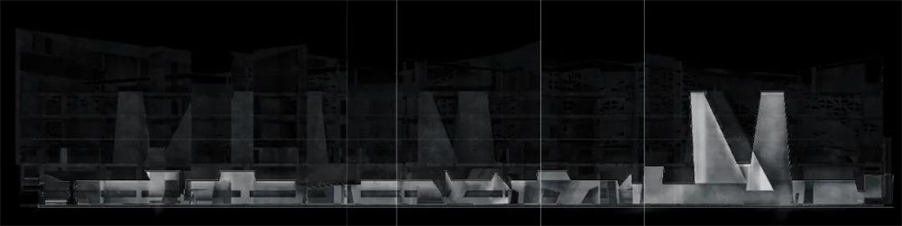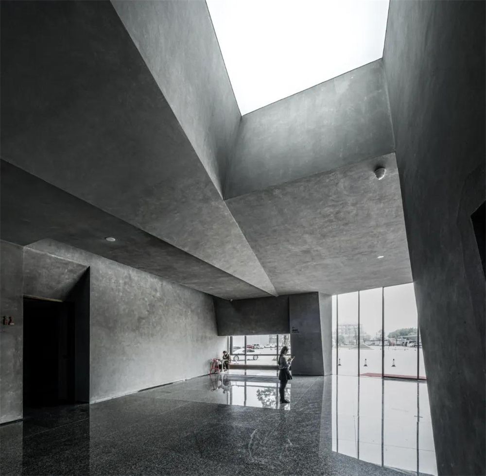 There is no other decoration within the exhibition space. The only element used to express the imprint of the eons of the deposit is a series of the tiled wall. This simplicity brings visitors a prepositional spatial, dimensional, and sunlight experience. The walls are not only the boundaries of different function, but also reformed into a calm and cold, cave-like environment, which make the geological fossil looks even more aged. The inner wall of the crystalloid is the ceiling of the museum at the same time. The outside of the wall functions as the reflected board of the office building, while it separates private and public spaces.