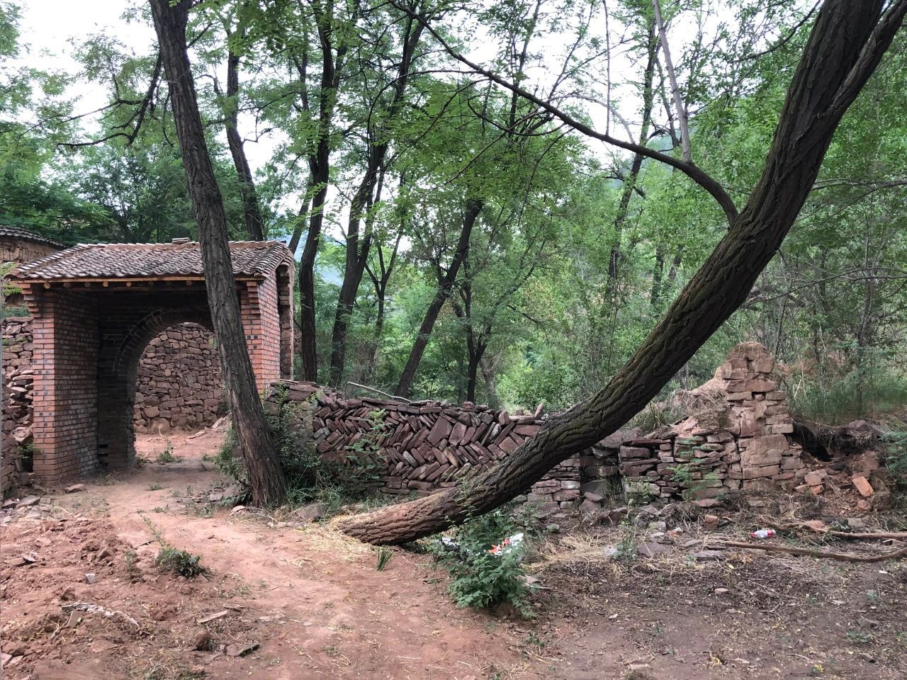 Half of the earthen house has collapsed, and the remaining half gives people a sense of time, yet without sadness. As the main buildings in the courtyard have collapsed, leaving only the base site, the trees in the site become another subject of vision and space. The species of trees here are not valuable, which are tall and thin, with black trunks, like a row of poles inserted in the field. They naturally become the foreground of viewing the venue from a distance. In a group of vertical "poles", there is a disparate one - a tree with a serious inclination in the middle of the site. The angle between the trunk and the ground is almost 30 degrees, which gives people an unreal sense of "rocking" and increases the dramaticism of the venue.