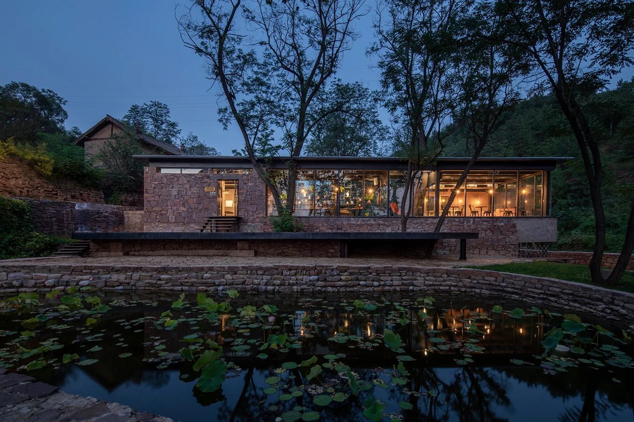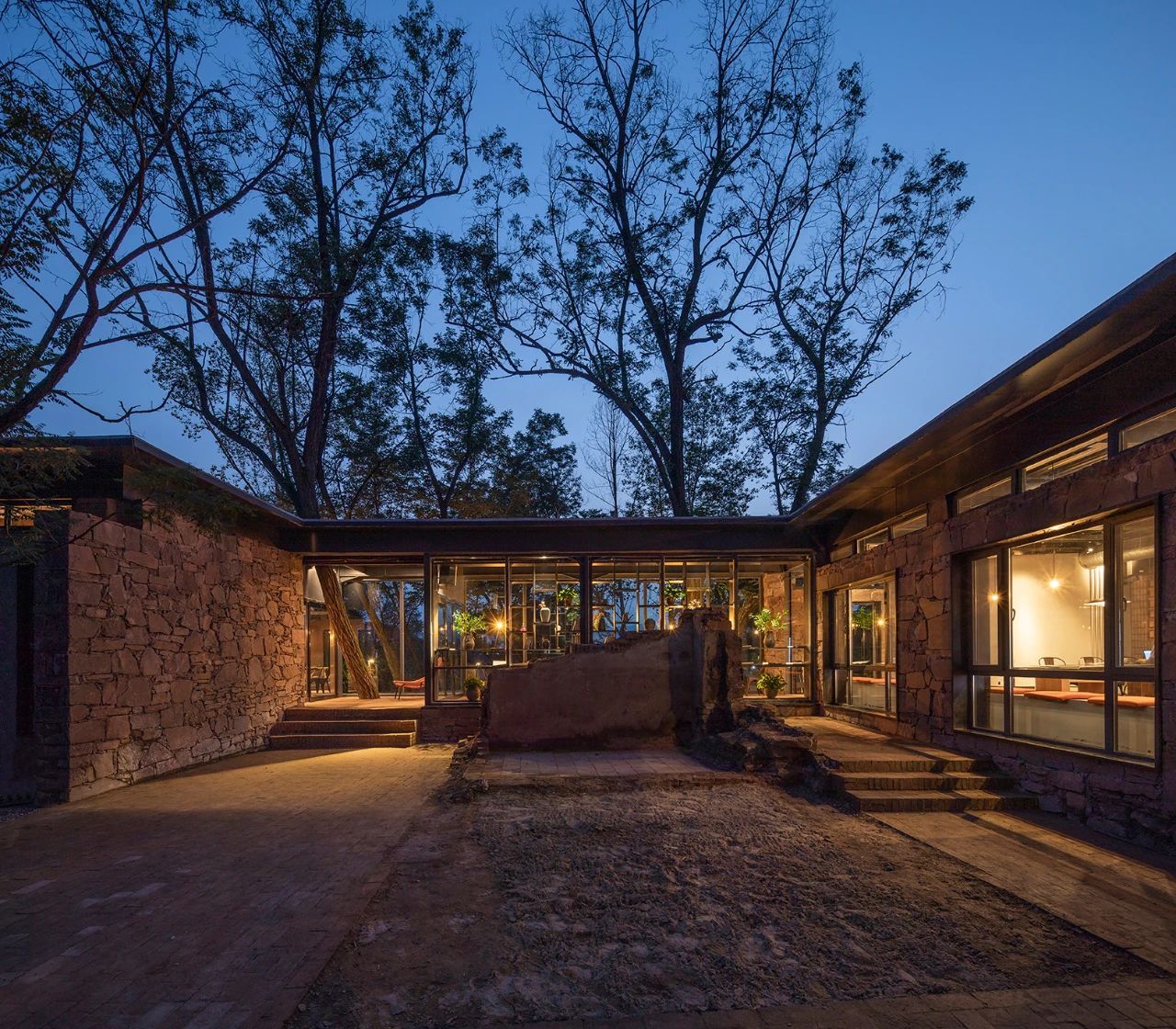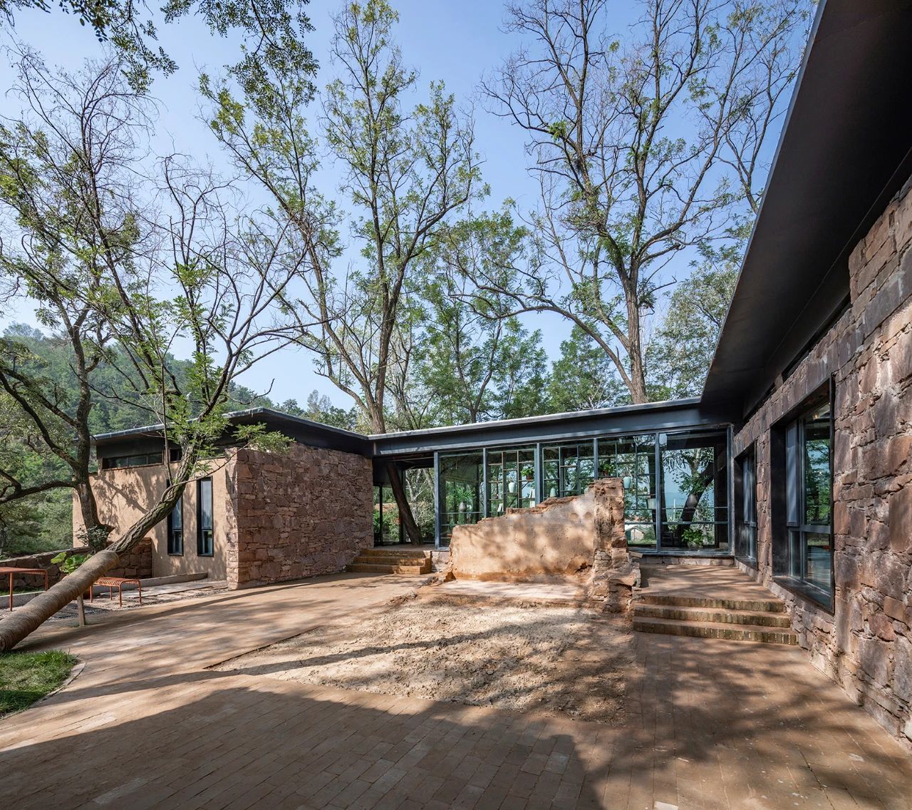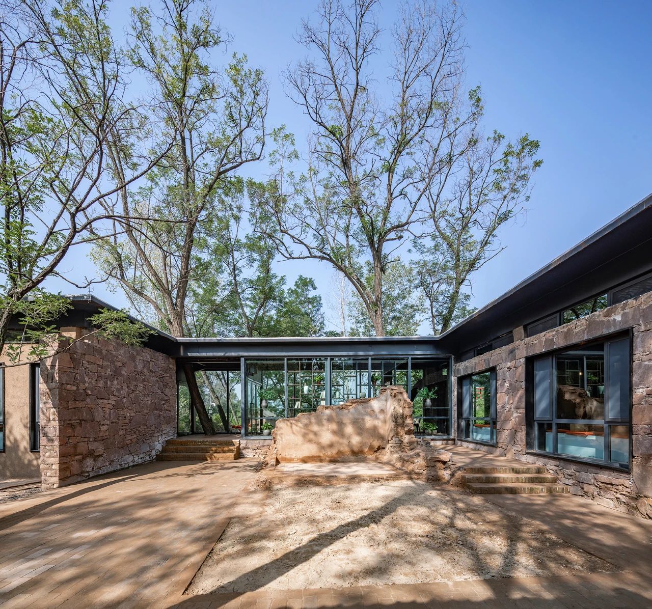 The opening and closing logic of building facade follows the logic of sight line and landscape. Parts of the exterior facade are open to the central landscape. The design of fullview glass windows introduces the outdoor scenery into the building. The interface between the building and the environment is softened by transparent materials, and the sight can penetrate indoors and outdoors. The wall facing the road is relatively closed, which is completed by local traditional stone-laying technology. The facade facing the inner courtyard is centered on the half earthen house, the part near which is fullview glass, while the facade away from which is mainly enclosed wall.