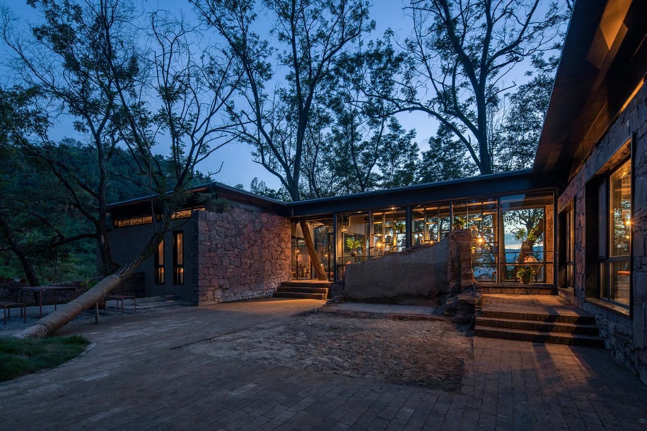 建筑立面的开合逻辑依循视线和景观的逻辑。外侧立面,面向中心景观的部分开放,落地玻璃的设计将室外景色引入建筑,建筑和环境的界面也被透明材料柔化,视线得以在室内外渗透。朝向道路的墙面相对封闭,采用当地传统的磊石工艺完成。面向内院的立面则以半间土房为核心,靠近它的部分为落地玻璃,远离老房子的立面则以封闭墙体为主。