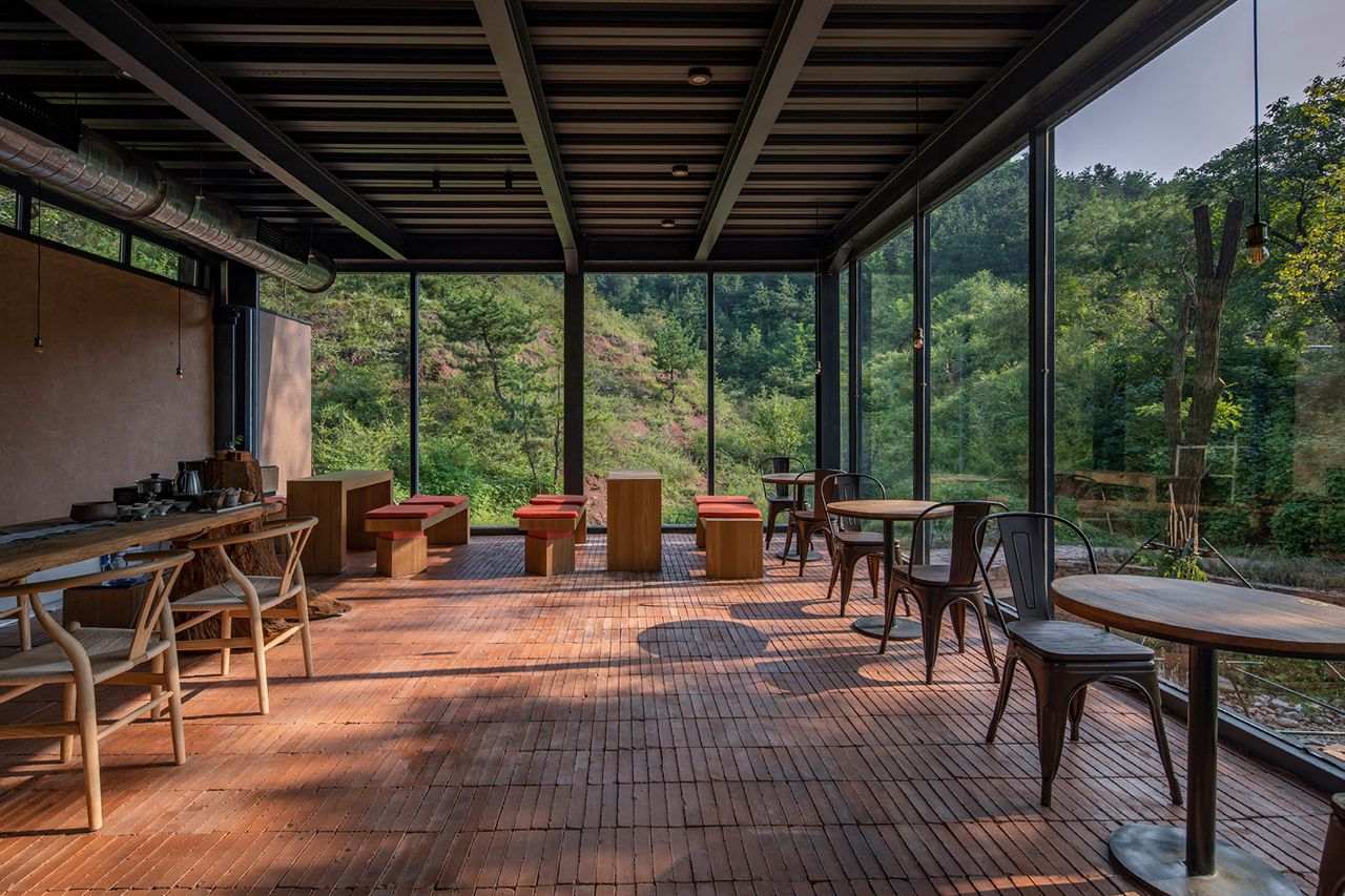 In terms of function, the new building is a cafe with water bar, which provides a main public leisure place for the guests of homestays in Hanhonggou. In order to protect the trees in the site, the interior of the building is divided into two areas. Between the two areas is a semi open gray space, and a tree goes out from the middle.