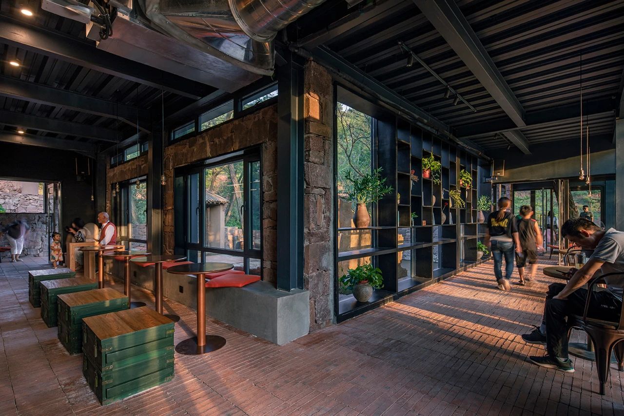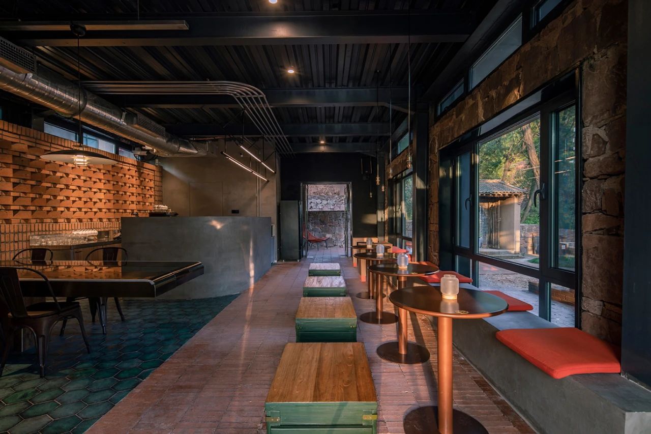Because the predecessor of the building was the Firearms Repair Bureau during the Anti-Japanese War, military naturally became the theme of interior design. The interior is not complicated and does not pursue exquisite luxury. The floor and walls are mainly made of red brick, which takes advantage of the good scale of brick, semi manual texture and warm body feeling, neutralizing the cold of steel and glass. The olive green glazed tile is selected for the ground partially, which forms the contrast of color and texture with red brick and enlivens the atmosphere. The bar counter and fixed seats are plastered with cement. With industrial style furniture, ammunition box shaped benches, and exposed roof equipment pipelines, the space gives a strong and tough temperament. The choice of naked bubble lighting, warm yellow light, slightly dazzling glare, all imply the leisure identity of the space.
