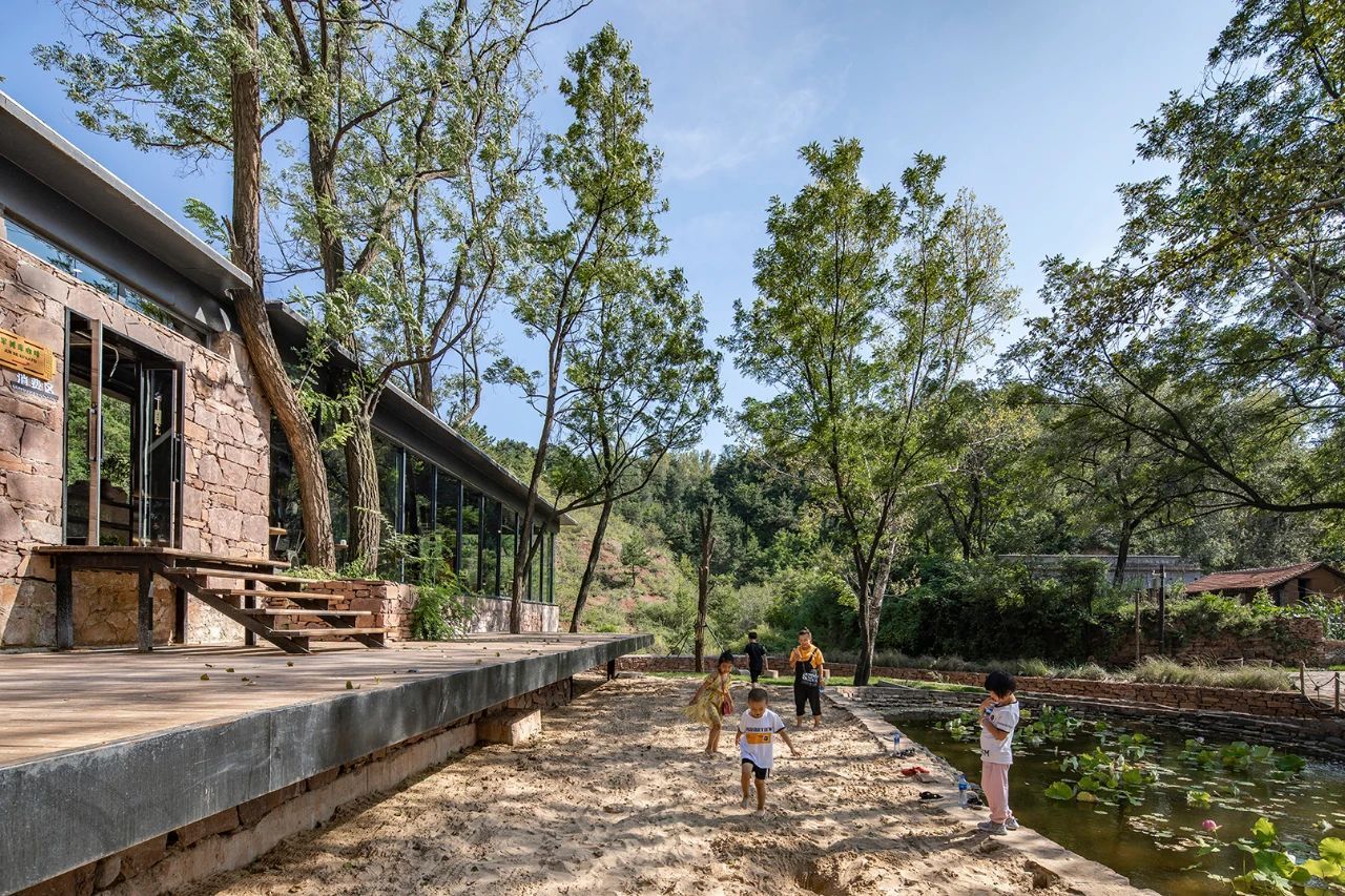 After observing the site, the architect decided to preserve the half earthen house together with the trees and build a new spatial relationship based on them. The new building gives way to the old house and trees in the shape of the letter L, of which the inner side is the half earthen house, which is half enclosed by the new building. On the outside of the long side of the L is a row of vertical trees, which form a silhouette in front of the building. The "rocking tree" is preserved and still tilts to the building. In the architect's imagination, children can naughtily walk up the sloping tree trunk and then jump down from half height, as a part of their childhood.