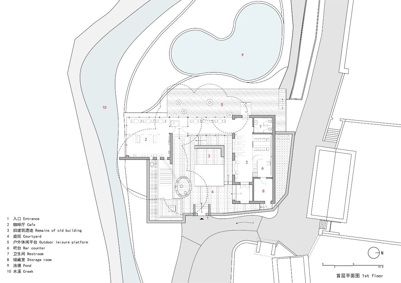 在功能上,新建筑是咖啡厅和水吧,它为韩洪沟民宿客人提供了主要的公共休闲场所。为了保护场地中的树,建筑室内分为两个区域,两个区域之间是一个半开放的灰空间,一颗树从中间穿出。