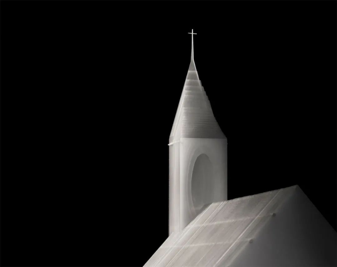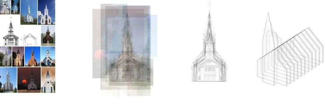 作为建筑的外部形象,我们认为它必须是纯粹的,以使人得以回归小礼拜堂的原型和认知。故而设计过程中,数百个乡野传统教堂的空间及立面形象的抽取,共同勾勒出了一个符合认知意义通感的体量轮廓(切片)系列。