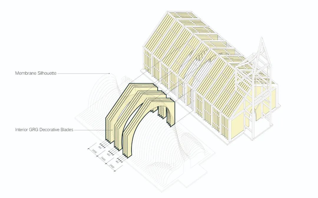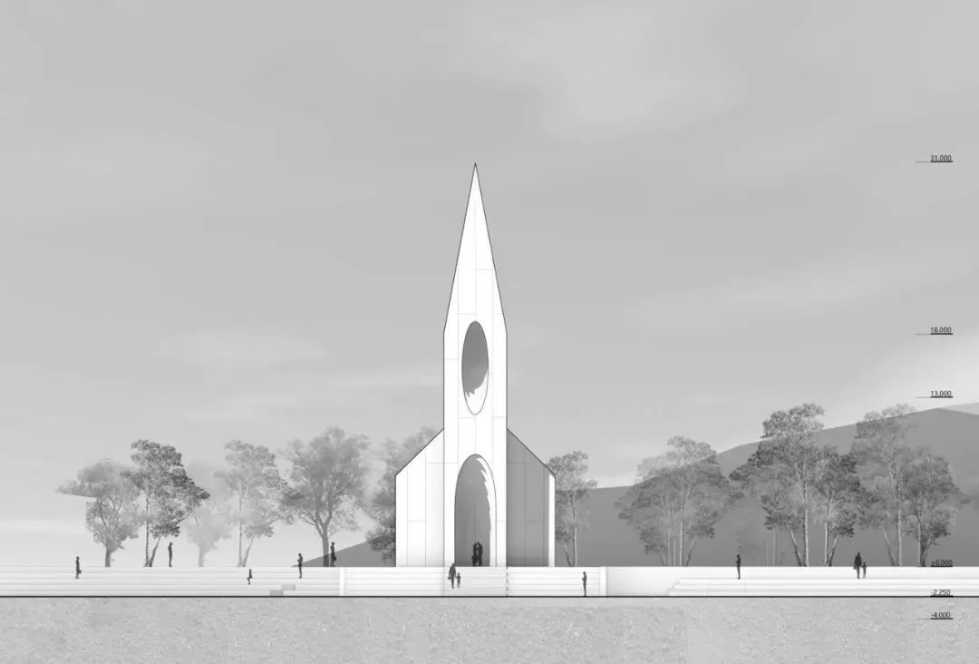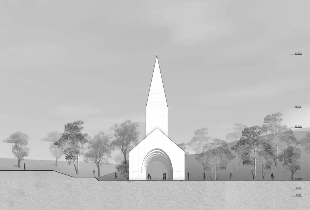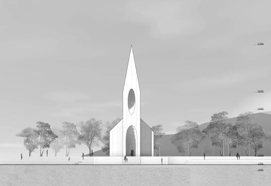 这个被提取的原型,依然拥有具有尖顶和花窗的钟楼、层叠内嵌拱门、巴西利卡式的空间布局等礼堂所具有的经典组成要素,但多数的装饰要素均被抽象化 -这并非源于对装饰的厌恶和反叛,而是期待以相对纯粹的体量展露出属于此一命题相关的原型与体验层面的关联,以及与其相关的核心议题:神性与仪式感。
