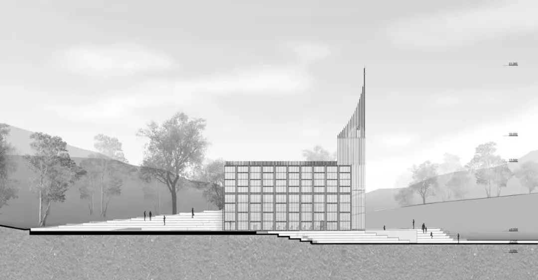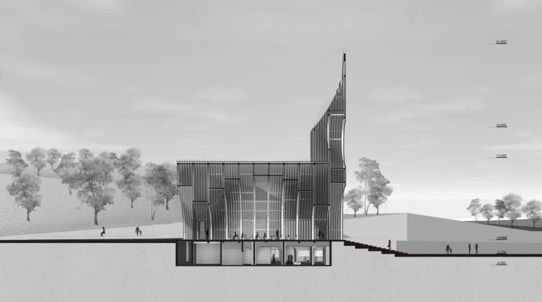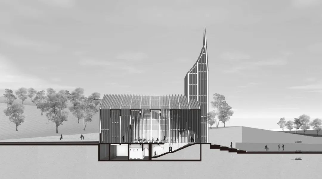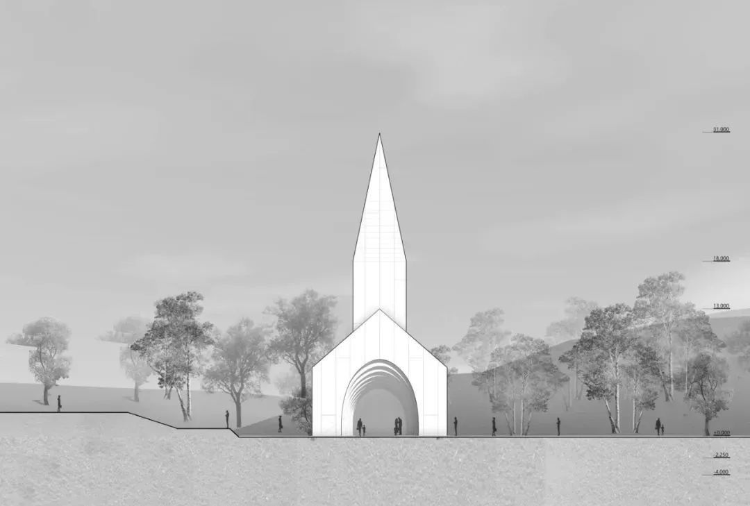 月空礼堂旨在打造一个既尊重过去又能面向未来,既具有宗教体验又面向世俗感触的空间容器。礼堂分为上下两部分,下部的半下沉空间以及出口庭院与周边场地景观相连,嵌入与广场相连的山体,关联亘古既有的存在,是隐;上部圣堂本身则应傲立于山水之间,宏天地之正气,传造物之福音,是显。