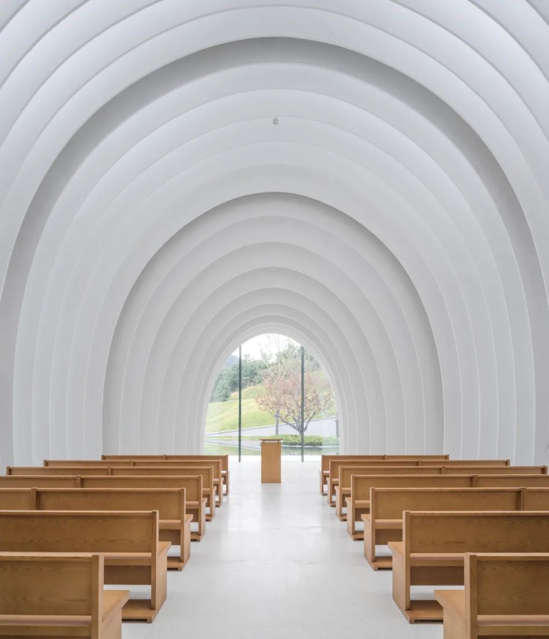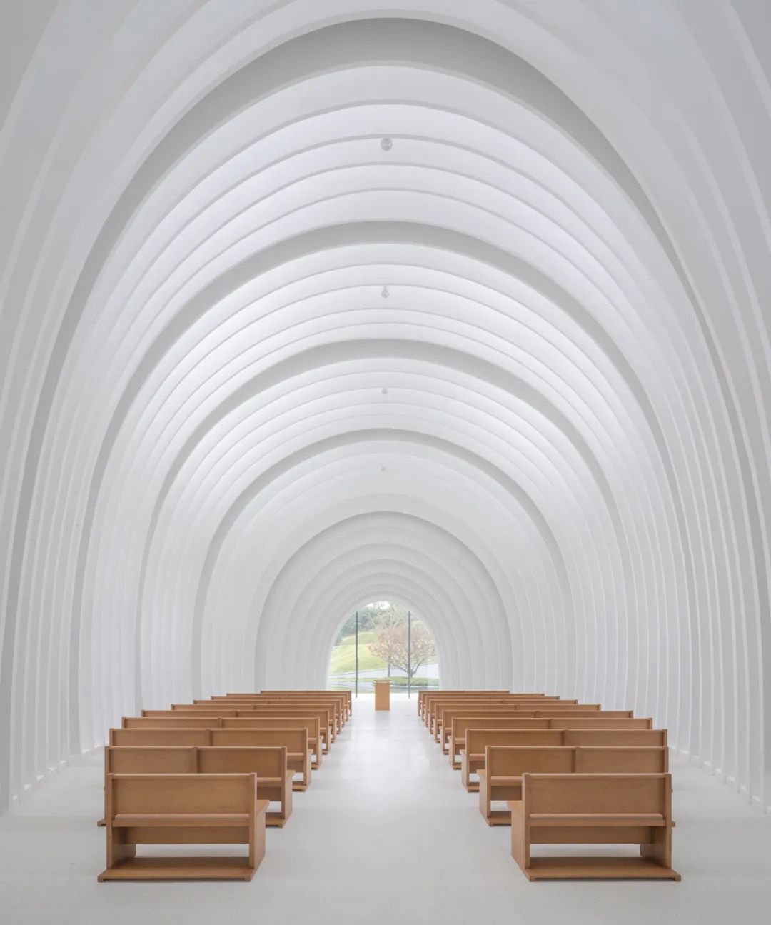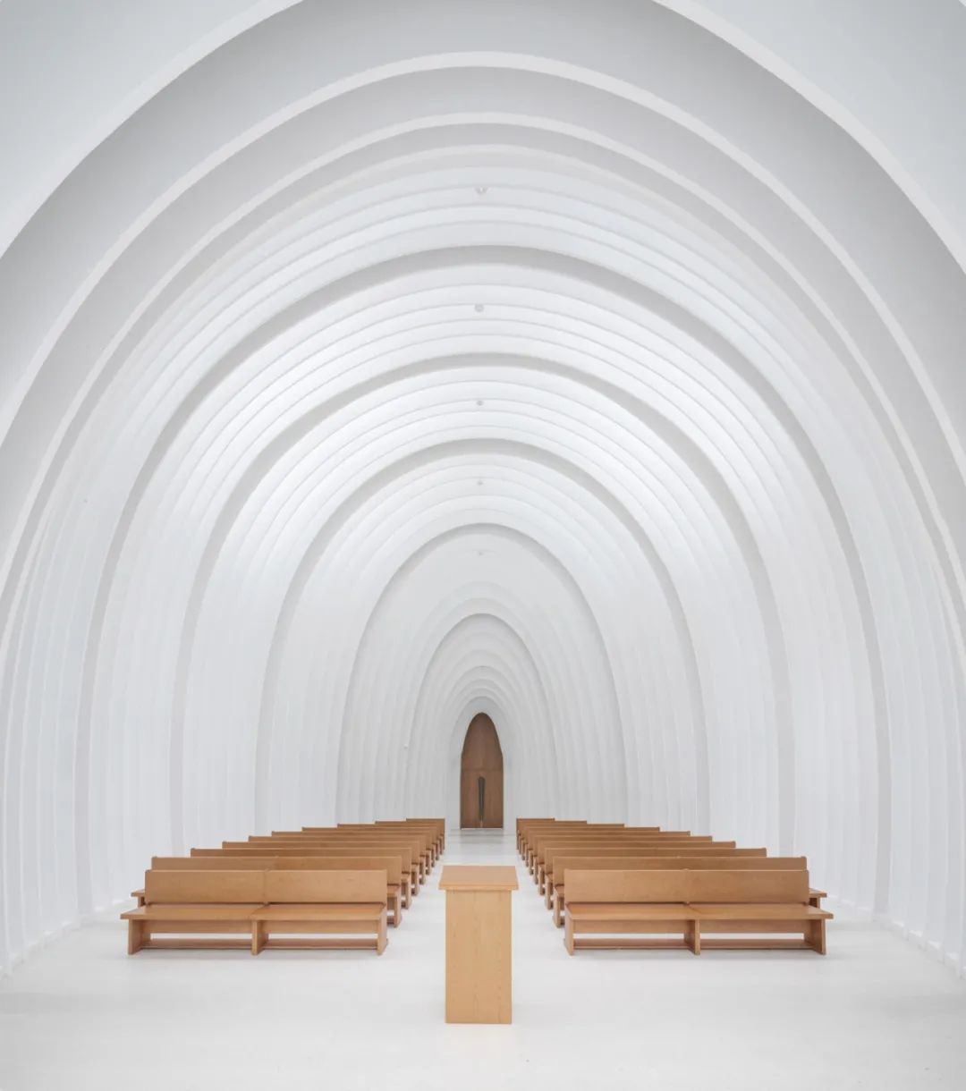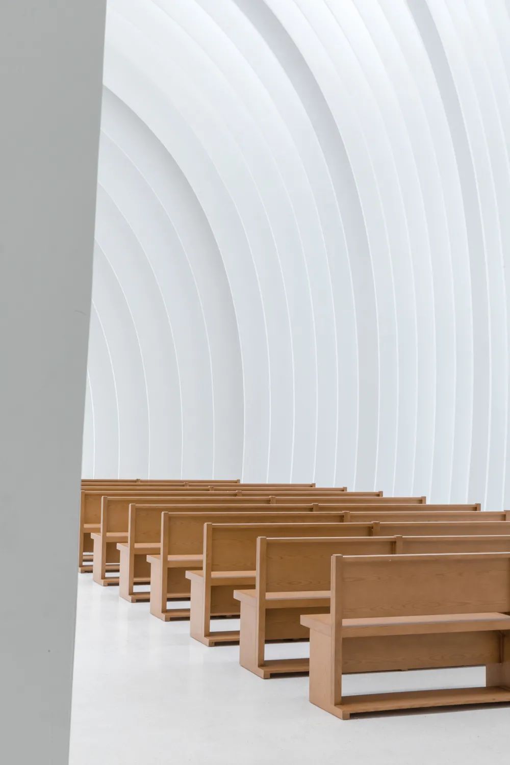 柔和的弧线形的内部空间遵循传统的长方形教堂的平面形式,用一种更加现代的解读方式,创造一系列弧顶架使得内部空间具有更加流动的体验感。