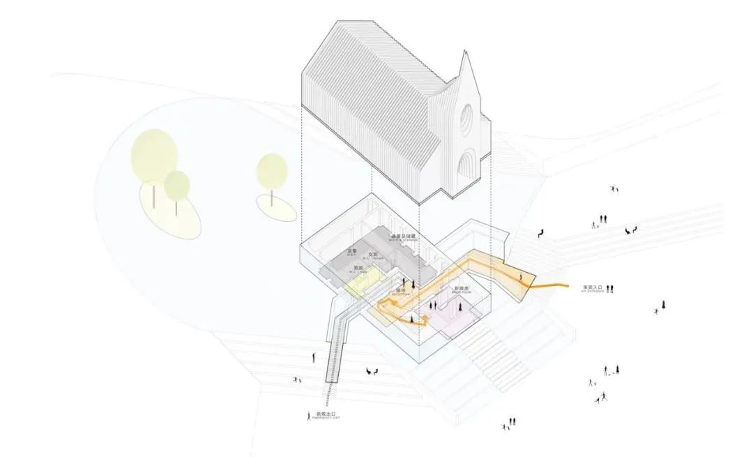 景观部分移步异景,强调私密性;广场部分相对开敞,强调开放性和公众性。高差的变化使得教堂前场形成水景阶梯产生的抬升空间,作为视觉上的底座部分进一步强化礼堂主体的仪式感与神圣感,相应建筑的下半部分则作为圣堂主体空间的辅助空间,包括接待台、准备间。