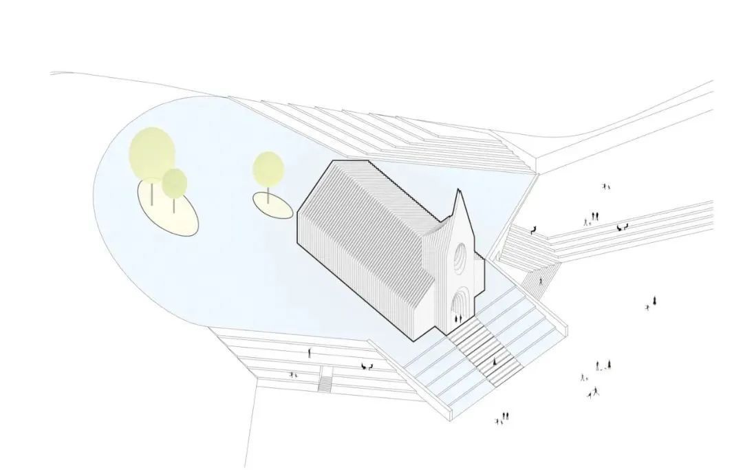 总平面倾向于一种更加内向的氛围,利用一系列景观对视线的遮挡和背侧湖水的平静,打造一个教堂入口前的“舞台“去强调其核心的位置。
