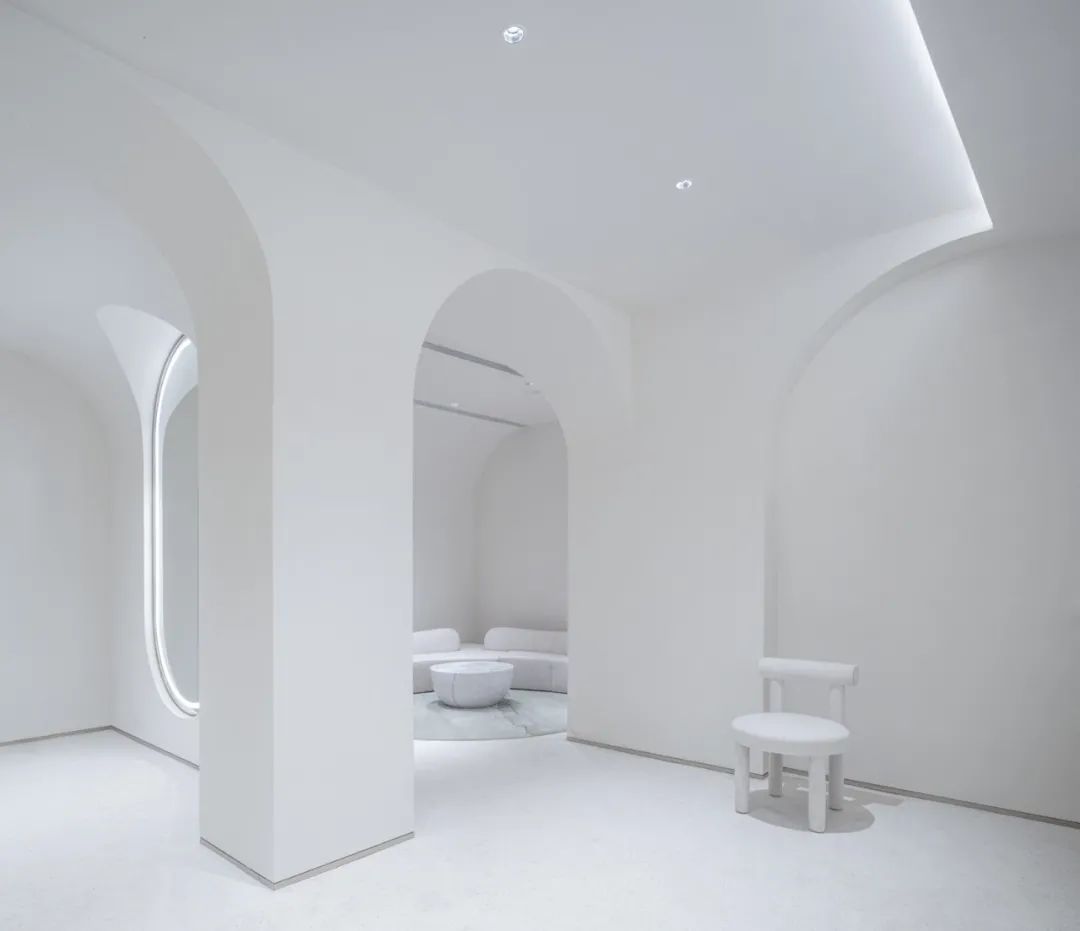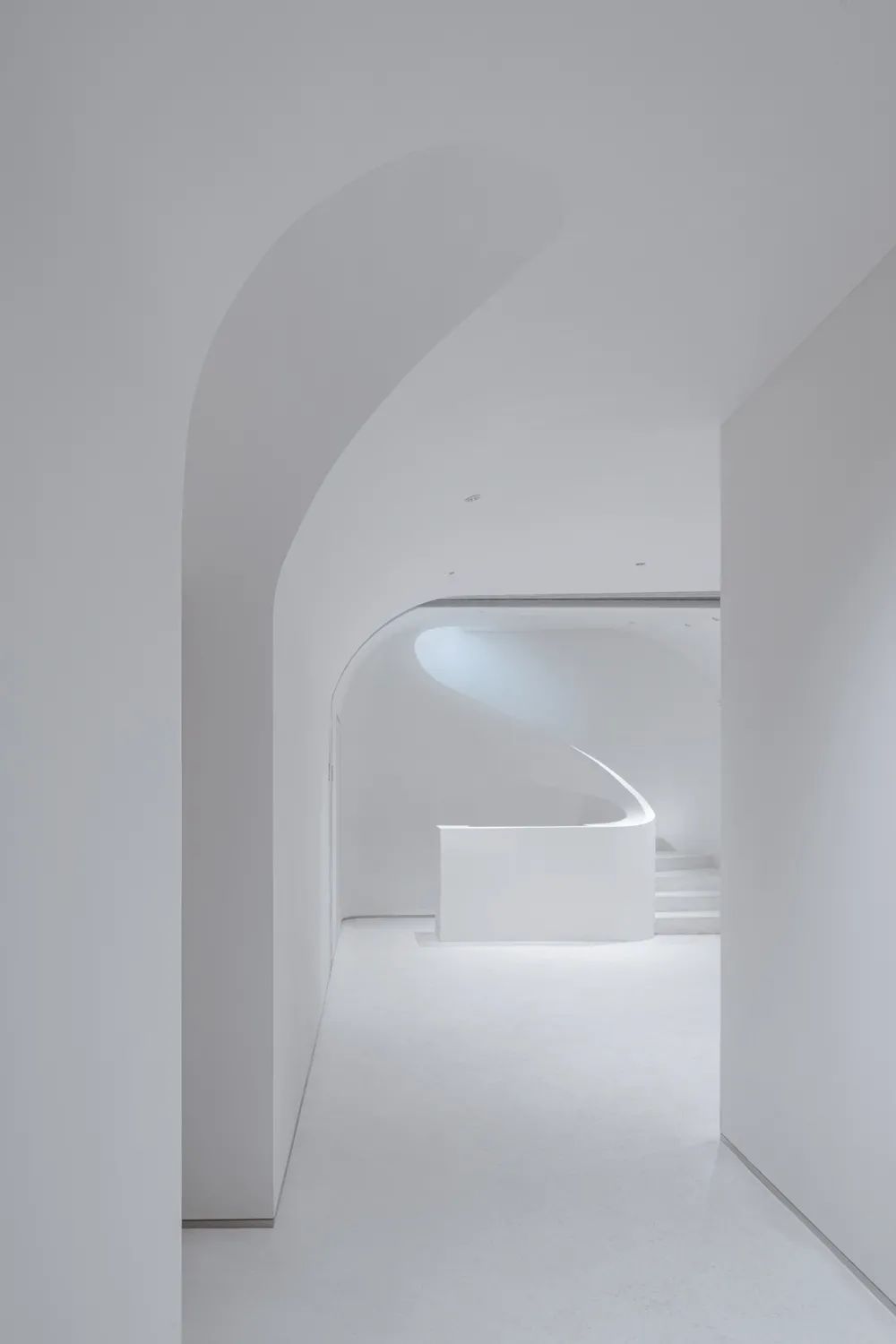 设计提取一系列柔和的曲线随空间序列缩放,形成一个内敛的腔体,其基线关系依然延续传统的巴西利卡的形制,而同时具有极强的流动感。而这些曲面在三维层面则形成一个更具未来感甚至永恒感的状态。同时,这种柔美与其外部坚硬的状态形成强烈对比,以形成内外视觉的互动。