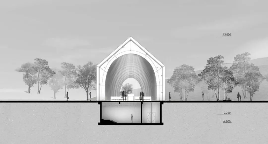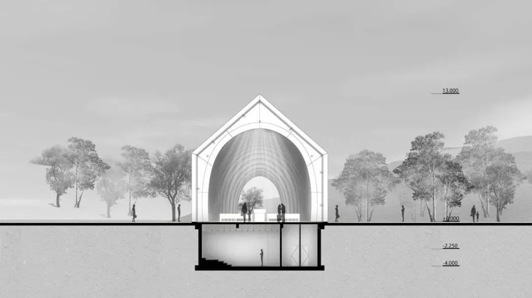 由此,礼堂的腔体空间尝试以环抱的形态给人们某种安宁和庇护的感受,正如洞穴曾经那样,为举办仪式的人们提供所需求的仪式感和神圣感,并进一步触发人们现实与精神层面之间的关联。