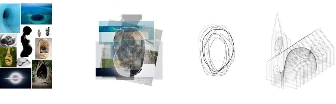 故此,作为主要使用空间的礼堂内部我们希望它体现一种心灵回归和庇护,就如达芬奇的名画“岩间圣母”中所传递的意向,内部的空间是访者心灵的“庇护所”,或如婴儿在母体中的状态,或如克利姆特画中金色的环抱,在这个纯粹的普照光芒的空间中,人们方能感受造物对众生之爱与造物之美好。故而礼堂的内部是一个软性而更为环抱的轻柔的存在。