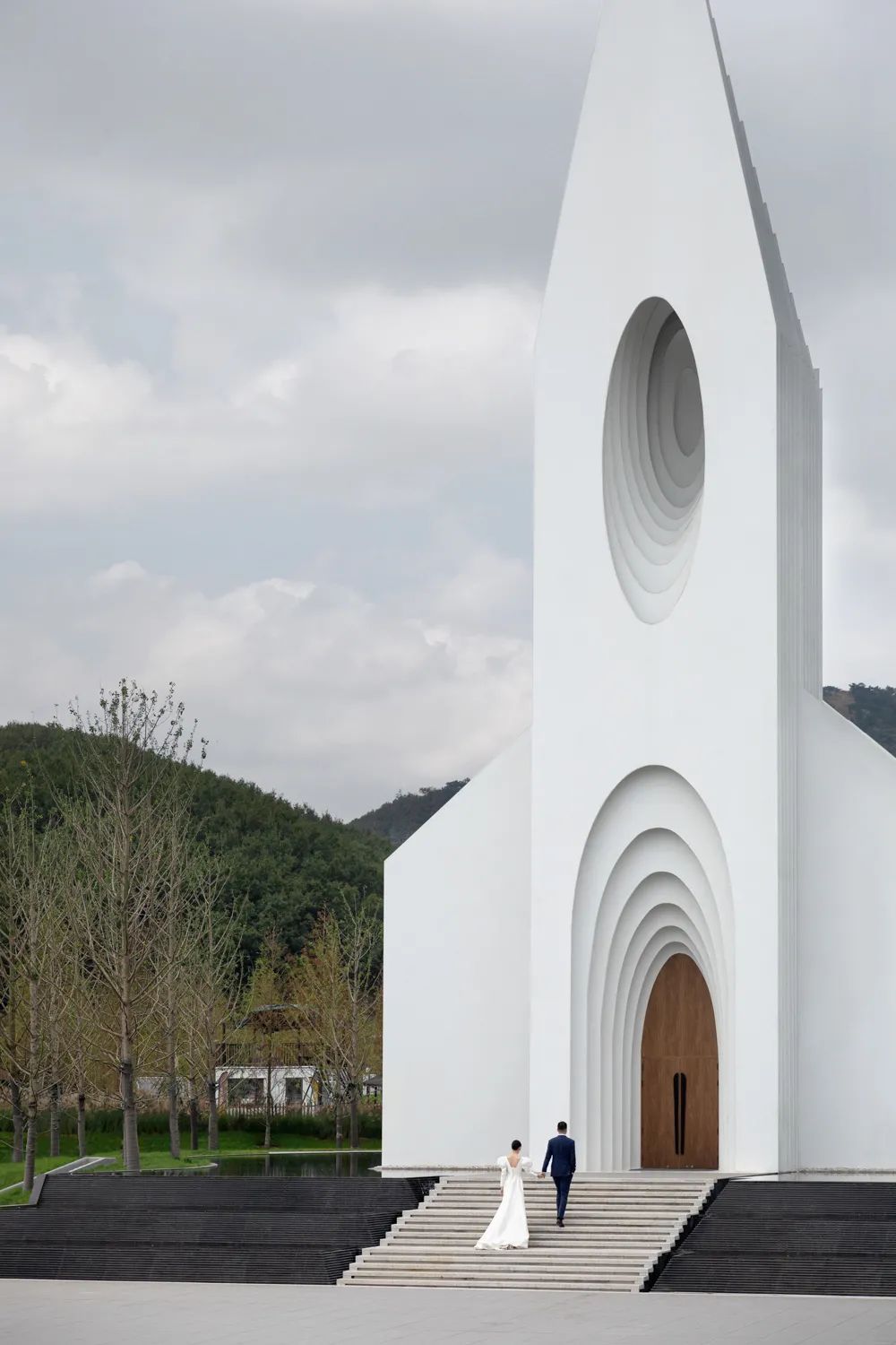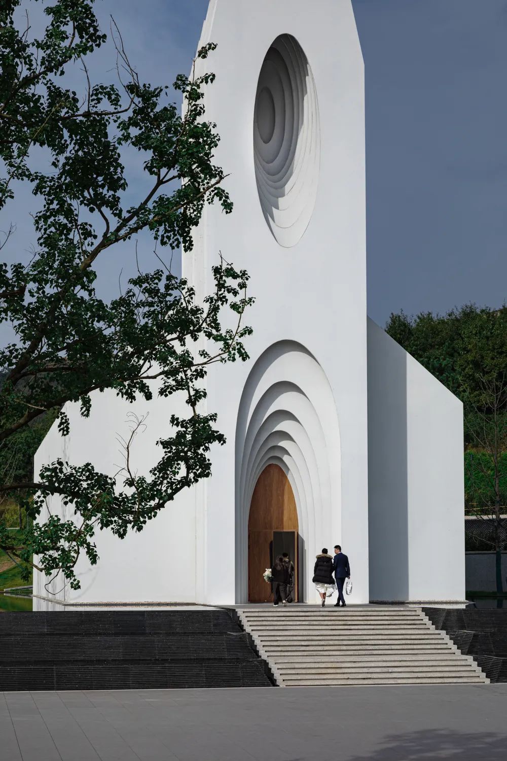这样的轮廓也从第一重的视觉的体验上符合业主和使用者对这一空间的想象与期待;而连续的每部分切片又以相对纯粹且现代的方式得以呈现,故而使礼堂的外部会根据观察者的角度变化而呈现出不同的效果。