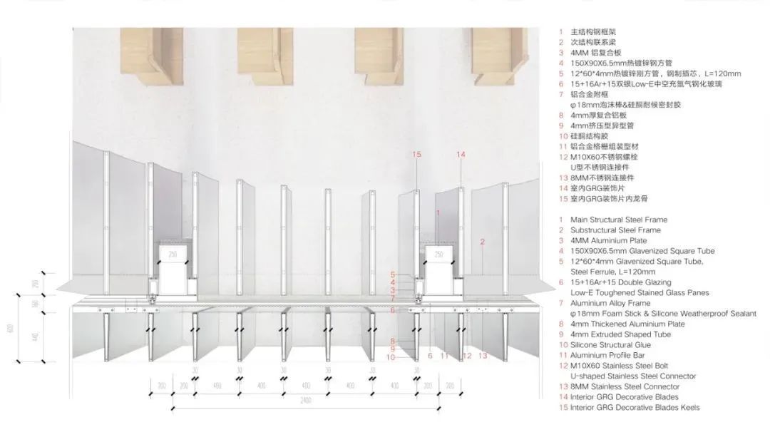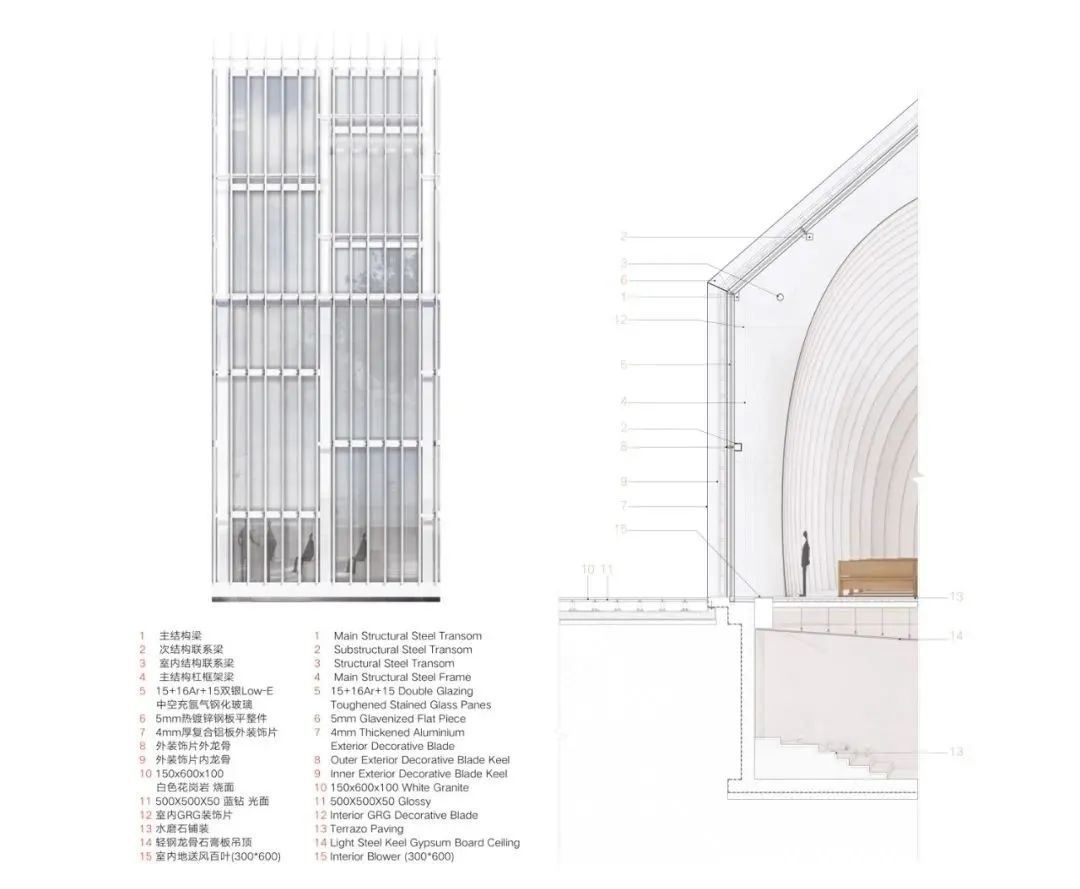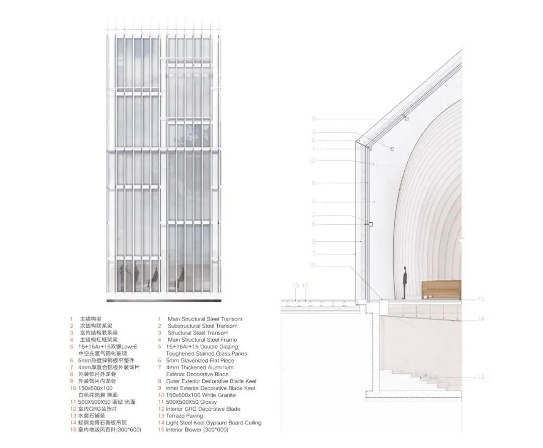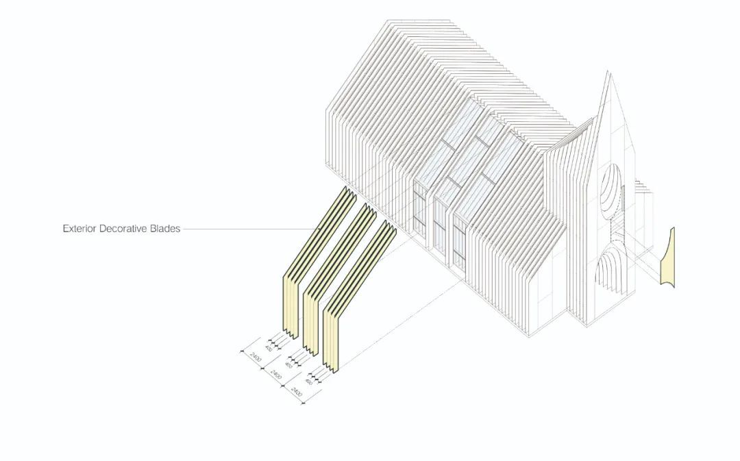 切片的形式所形成的内外轮廓的交叠使建筑在夜间泛出柔和的光线与简洁的外轮廓刚柔相济,同时让即使路过的行人也能感受到圣堂所散发出的神圣光芒。但其形式是用一种独特的方式形成的:一系列的铝板(外)/GRG(内)切片纵向排列。