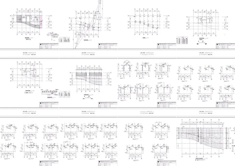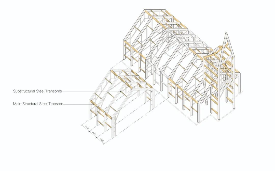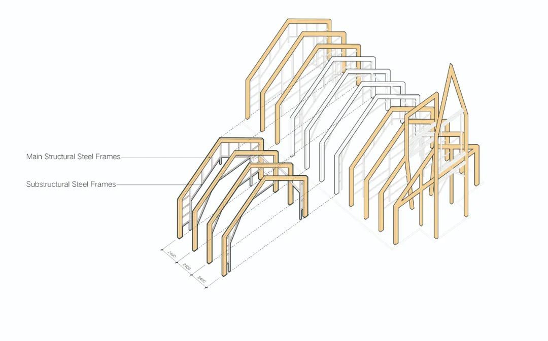 2.门式钢架由11组主框架,和每组主框架之间的10x6组副框架共同构成。主框架定义了婚礼堂的横向外轮廓,副框架则在龙骨的协助下定义了婚礼堂内部的“洞穴”空间轮廓。两重轮廓也形成了建筑外刚内柔的基本关系。