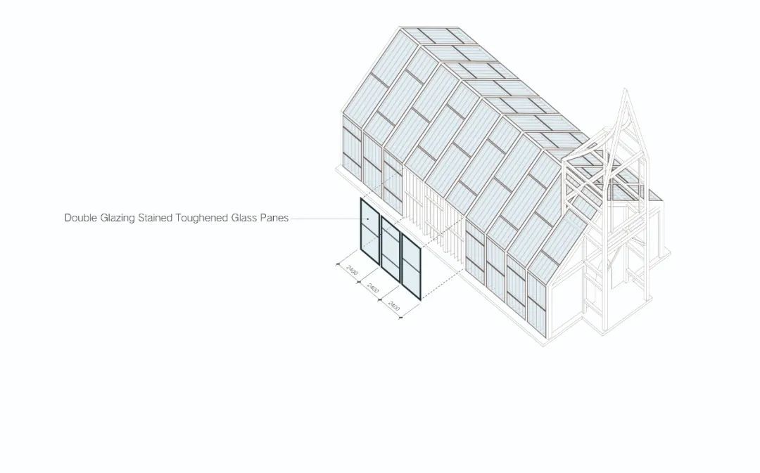 3.系列门式钢架之间的联系同样由两种级别的结构杆件实现:主梁贯穿并拉结所有钢架,同时明确地勾勒出婚礼堂的纵向外轮廓。副梁与主梁不同,其在设计中被有意错动了。一方面是在不增加杆件的情况下,减少了杆件之间的间距,使得整个建筑形成了一个类箱体的结构。结构的表达在纵向上被异化与消解,而横向门架在纵向上形成的空间递进感得以加强。另一方面,副梁同时成为了外立面构造的龙骨,实现了表皮与结构的融合。